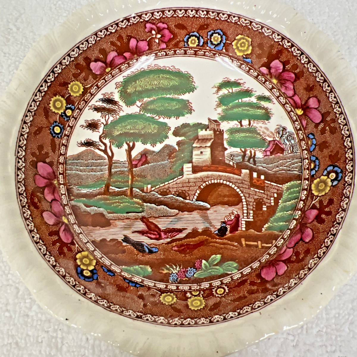 Antique Delft Copeland Spode Polychrome Spodes Tower Dessert Bowl 6 1/4" Wide. Pretty medieval scene tower, bridge birds on this polychrome dessert bowl that measures approx 6 1/4" wide, no damage, great condition no signs of use I find, coloring intact bright, old printed marking on bottom. See pictures.