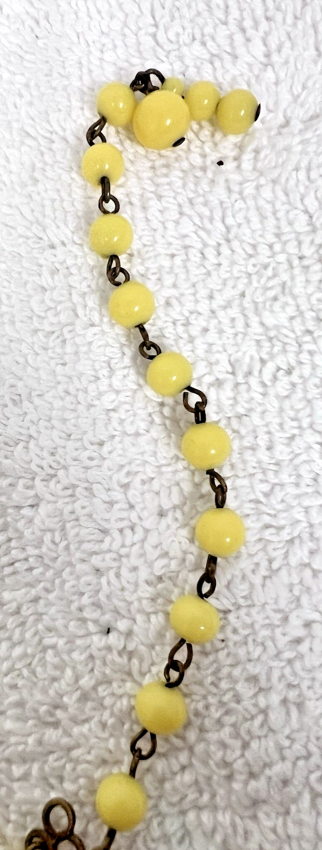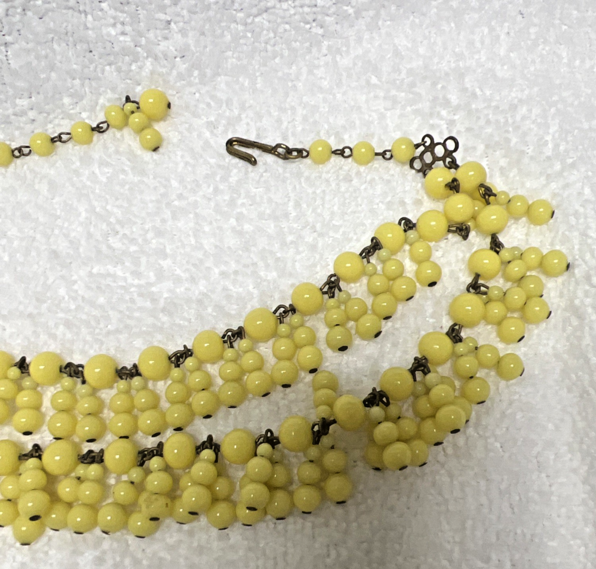 Vintage Glass Soft Buttery Yellow Hand Beaded Necklace w Dangles 2 Rows Fun from end to end it is 15.5 inches long and the beaded front is 1.5 or 1 3/4 inch drop