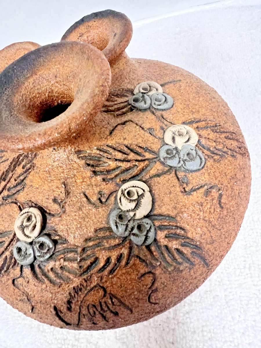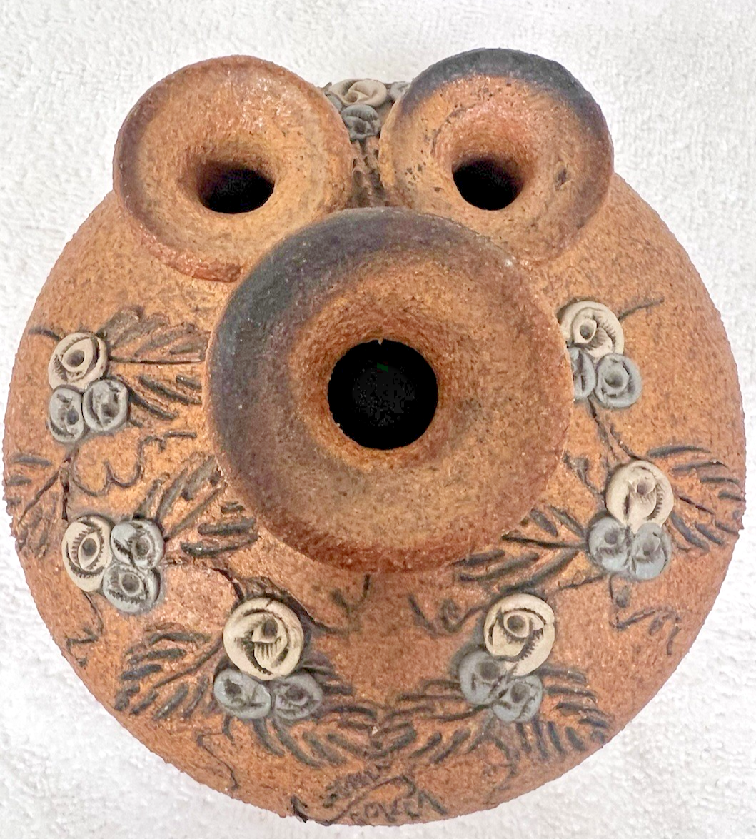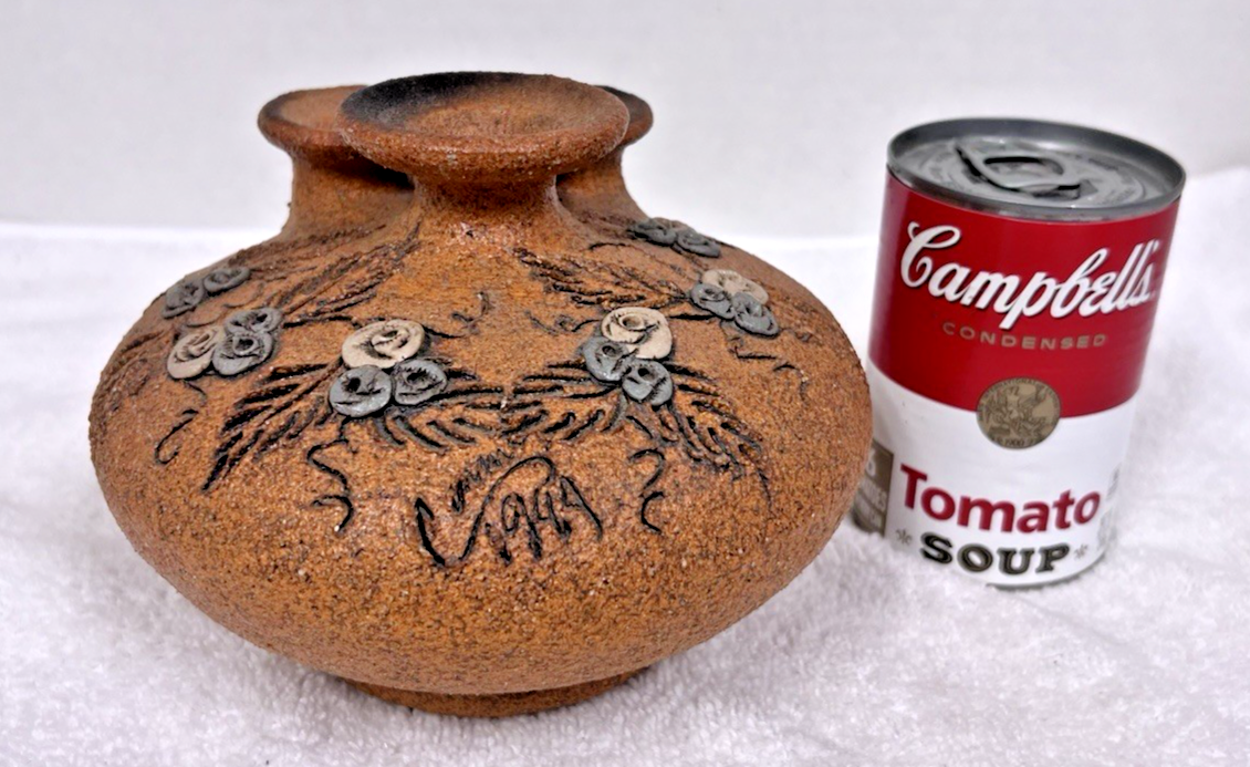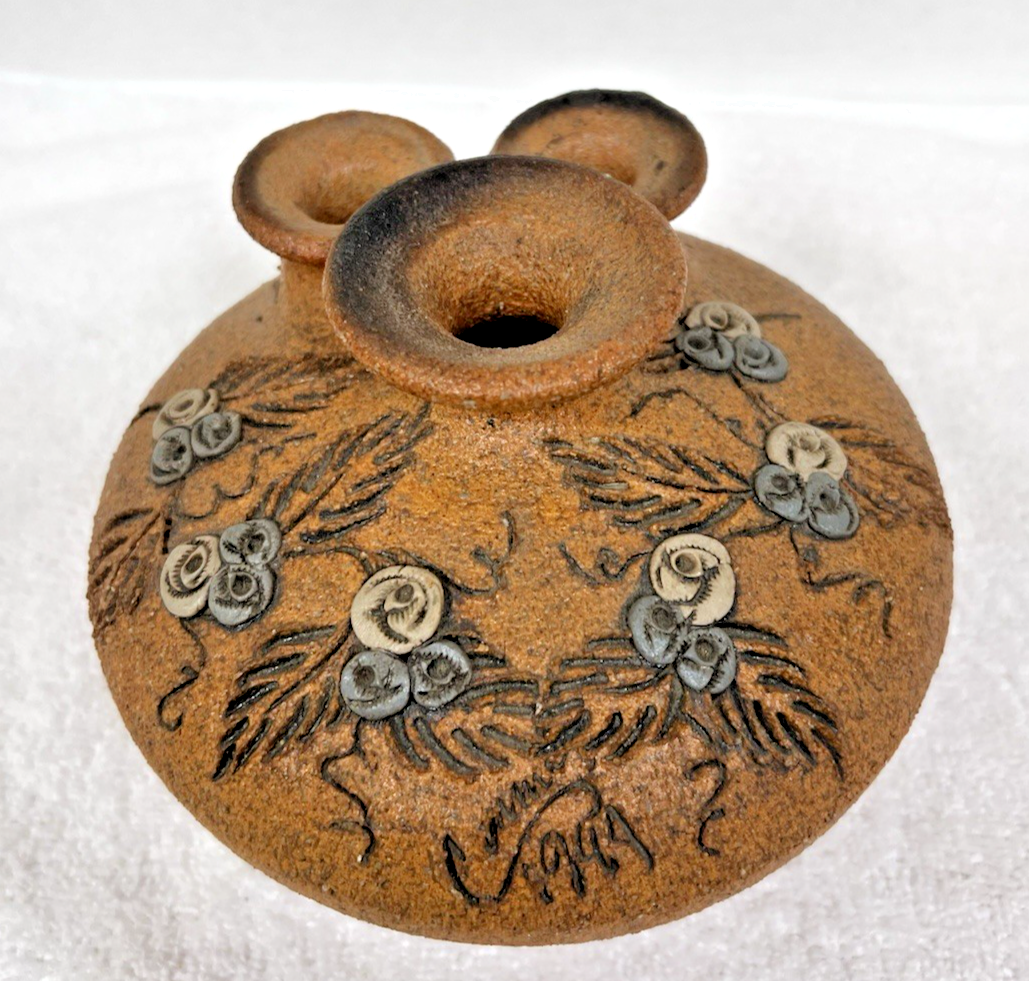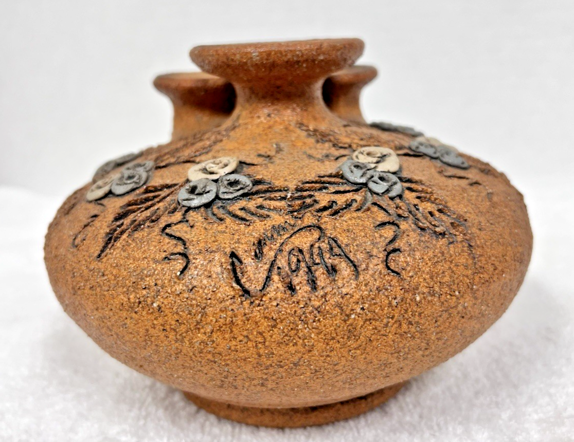 Vintage Handmade Carma Sand Art Pottery Floral Triple Wick Oil Lamp Vase 5 1/8". Triple wick or bud vase opening pottery vase or oil lamp measures approx. 5 1/8" tall and 6 1/4" wide, Carma and 1984 looks like the date incised on pottery ceramic piece, embossed molded raised flowers and incised leaves, very good condition, no chips, cracks, flowers intact, bottom shows some age wear, very good condition. See pictures.