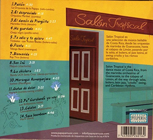 Product description: Salon Tropical es una seleccion de música bailable de Costa Rica, desde las orquestas de marimba de Guanacaste, hasta el calypso de Limon, pasando por la salsa, el bolero, el jazz latino, el swing criollo y los ritmos caribeños./ Salon Tropical is the dance music of Costa Rica from the marimba orchestras of Guanacaste, to the calypso of Limon, all the way trhough salsa, bolero, latin jazz, "criollo" swing, and Caribbean rhythms.