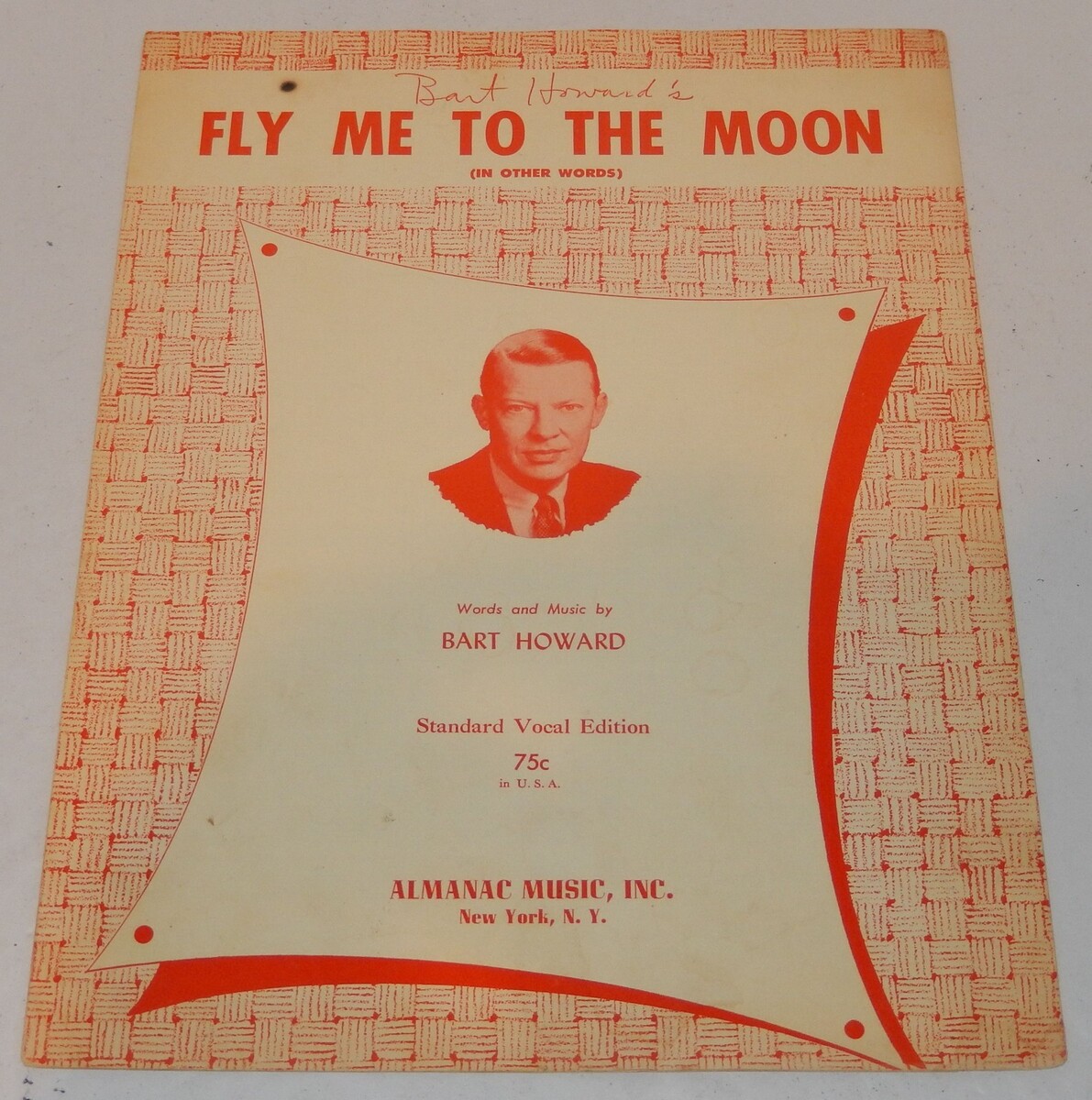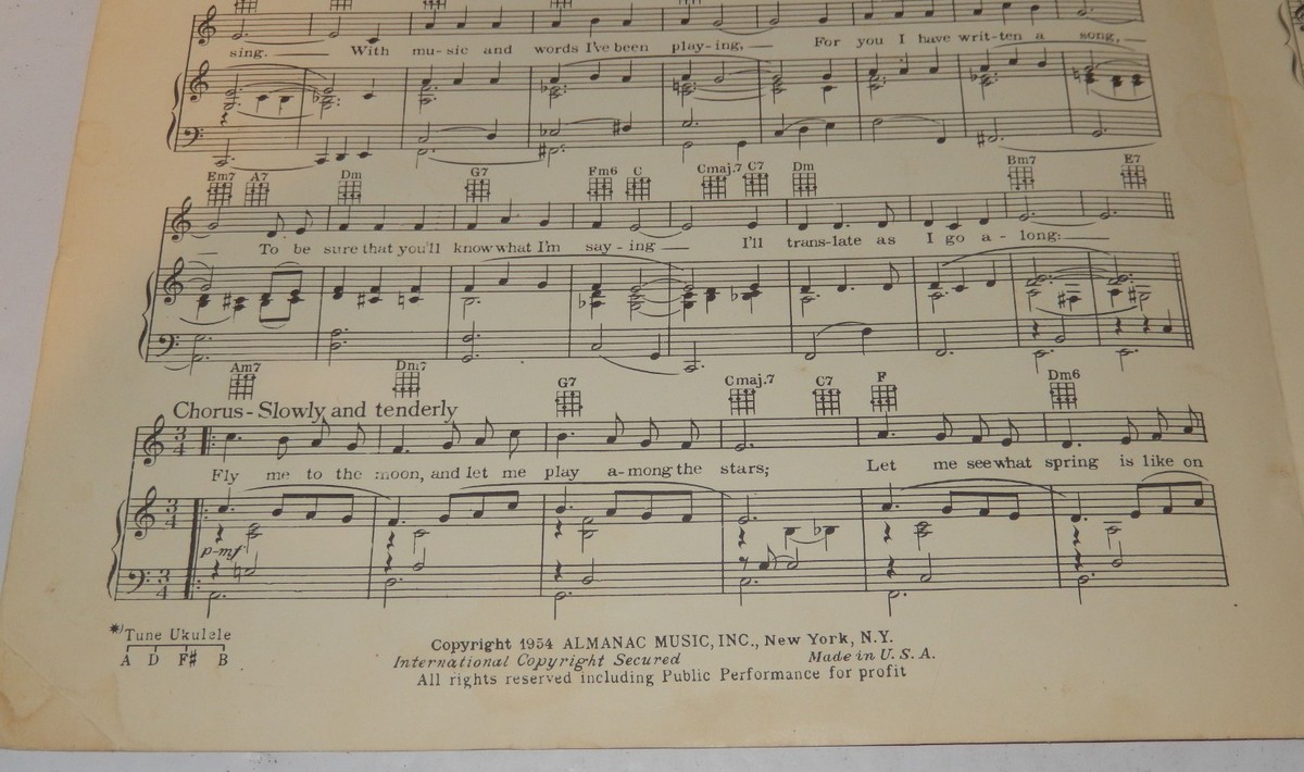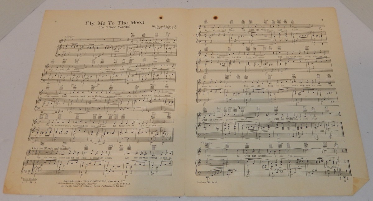 Up for sale is an authentic, original 1954 printing of the classic standard "Fly Me To The Moon" (originally published as "In Other Words"). This "Standard Vocal Edition" was published by Almanac Music, Inc. in New York and features words and music by Bart Howard.