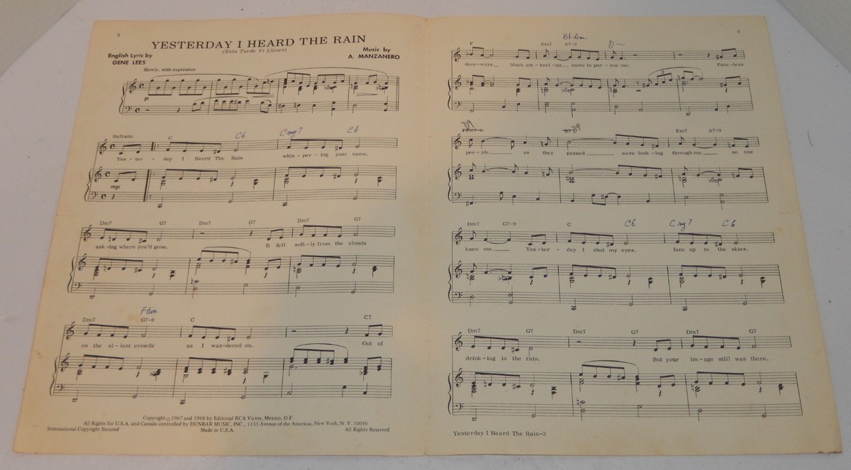 Up for sale is an original 1967/1968 sheet music edition of the classic song "Yesterday I Heard The Rain," famously recorded by Tony Bennett on Columbia Records. This piece features English lyrics by Gene Lees and music by the legendary Armando Manzanero.