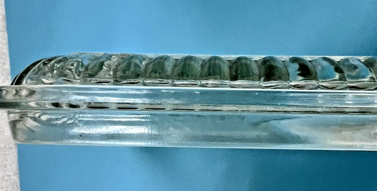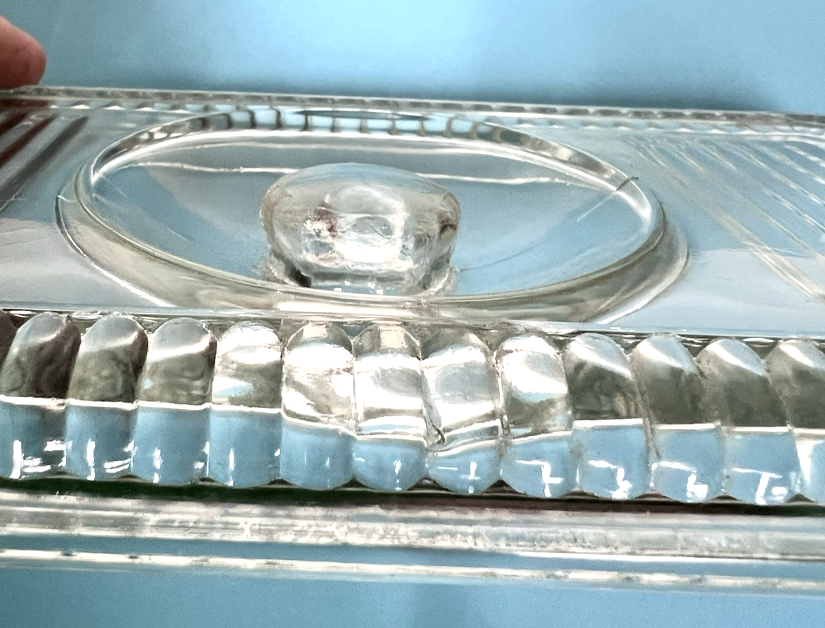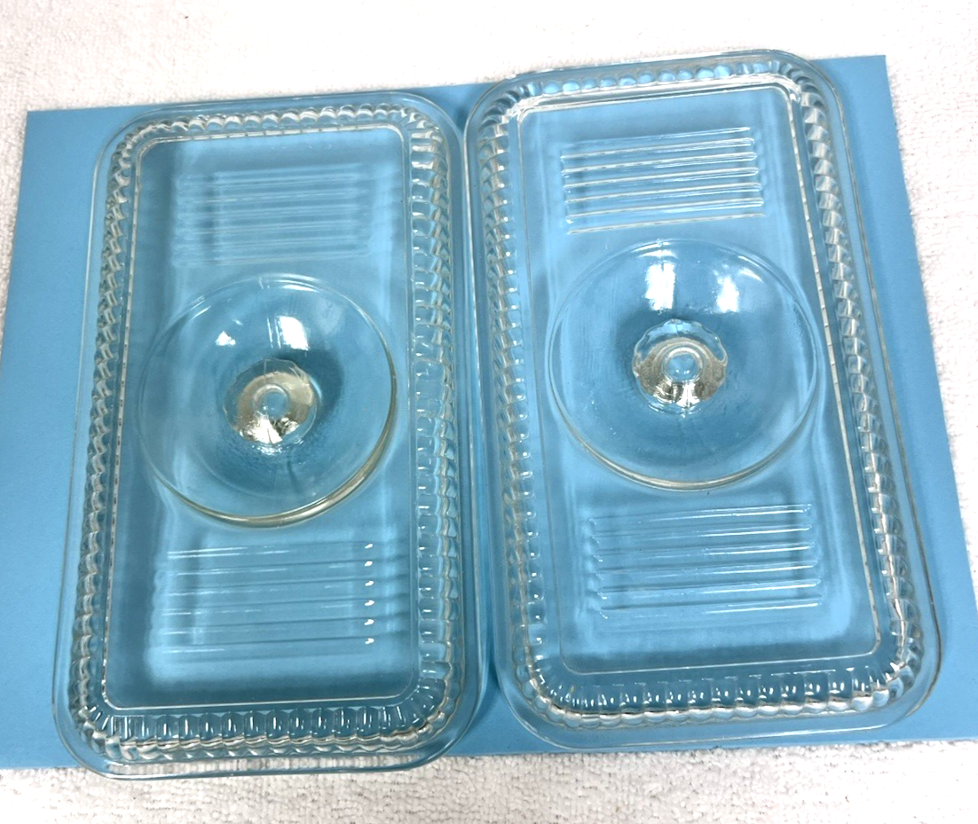 Vintage Hazel Atlas Ribbed Refrigerator Dish Inset Handle Container Lid Only. Rectangular shaped knob inset handle refrigerator dish lid measures approx. 8 3/4" long and 5 1/4" wide, ribbed patterning. No chips or cracks, slight roughness one edge inside rim, really nice used condition we have 2 for sale price is for 1