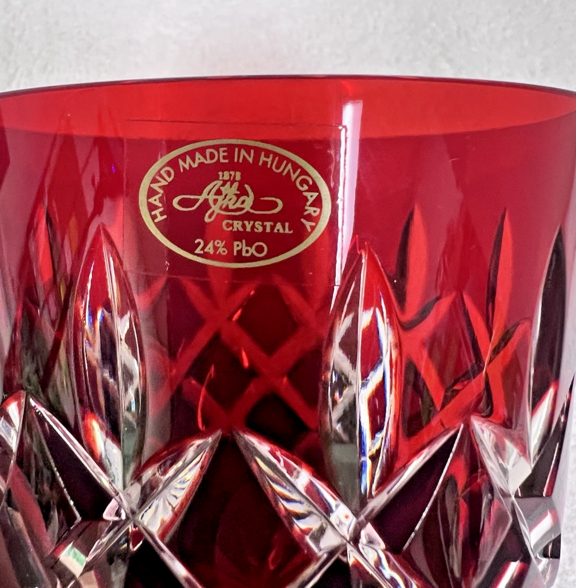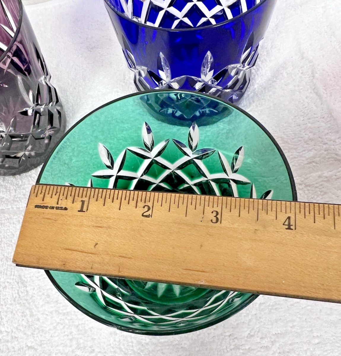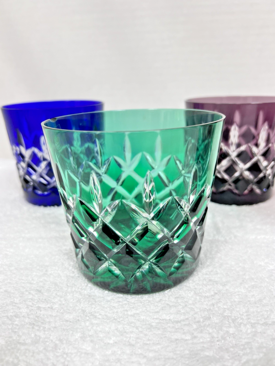 Older AJKA Arabella Cut to Clear 12oz Double Old Fashioned Glass Set of 4 Colors They all have the original stickers PLEASE NOTE the green has a chip it could be buffed out the rest are perfect 3 3/4 tall top is just shy of 4 Inches base is about 3 1/4 across