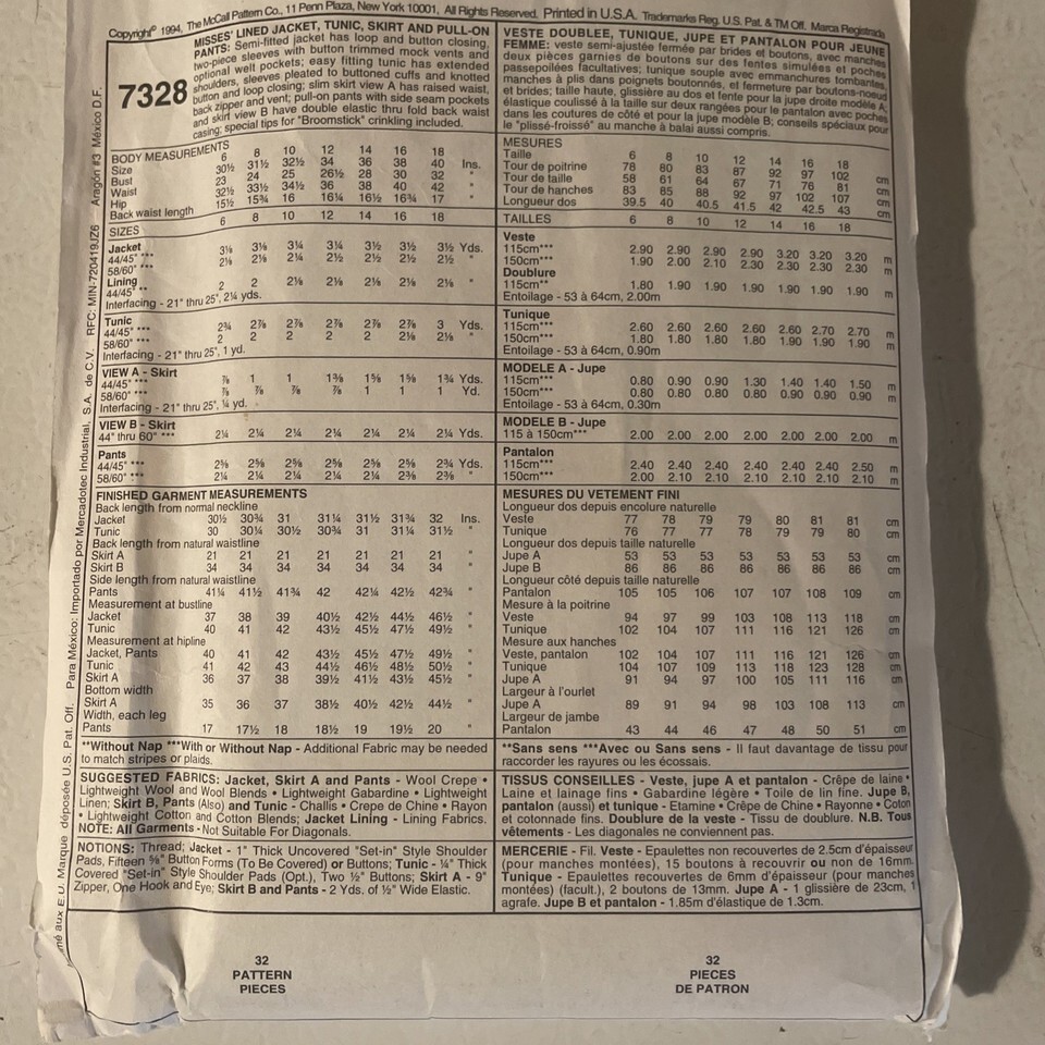 McCalls Sewing Pattern 7328 Jacket Tunic Skirt Pants Misses Size 14 Uncut