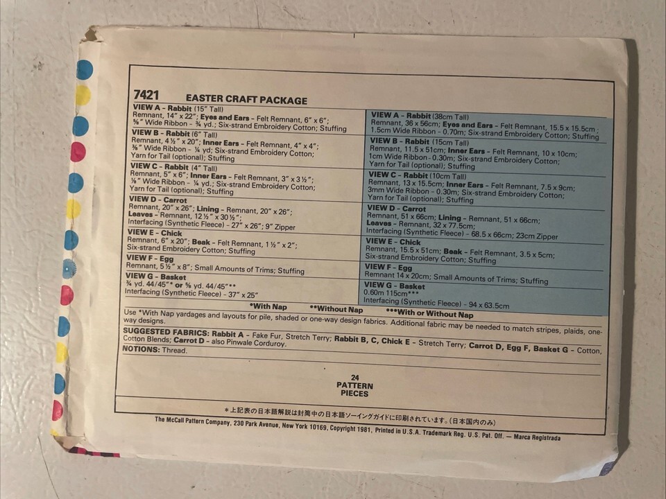 Rabbit Family Carrot Chick Easter Egg Basket McCalls 7421 Pattern Uncut