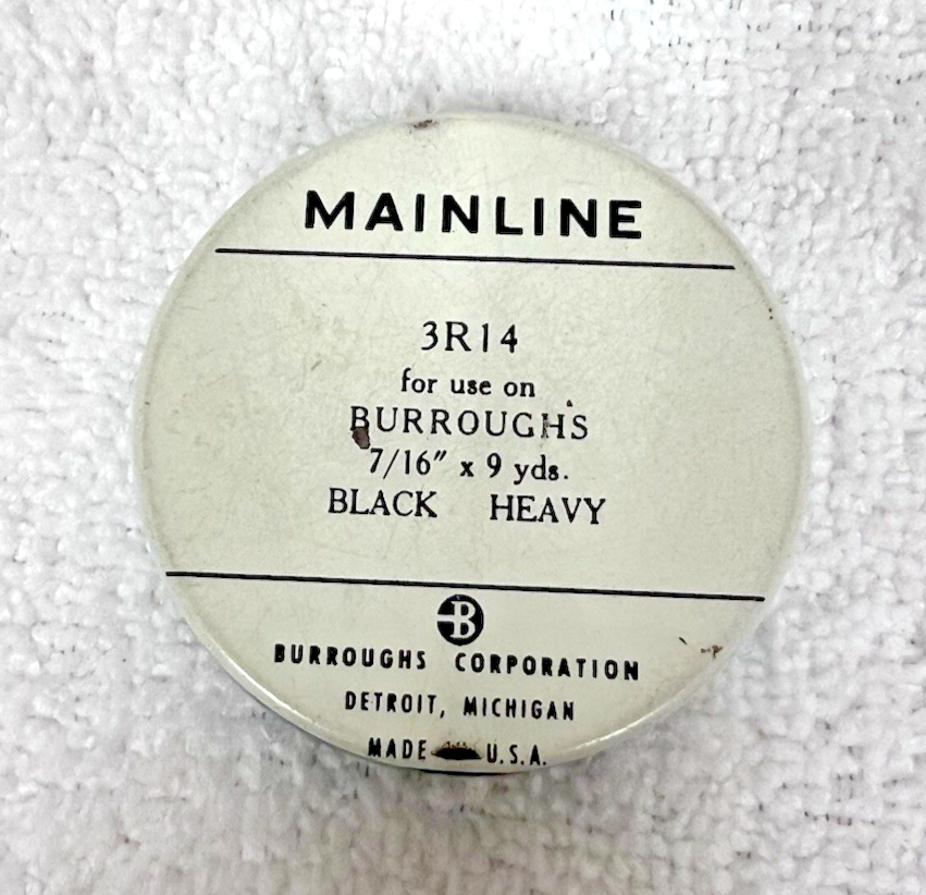 Vintage Burroughs Mainline Typewriter Machine Inking Ribbon Tin Container. Very good condition round typewriter ribbon tin for Mainline Ribbon Burroughs Corporation Detroit, tin measures approximately 2 1/8" wide and 5/8" tall/deep, great condition, minimal wear, inside clean. See pictures.