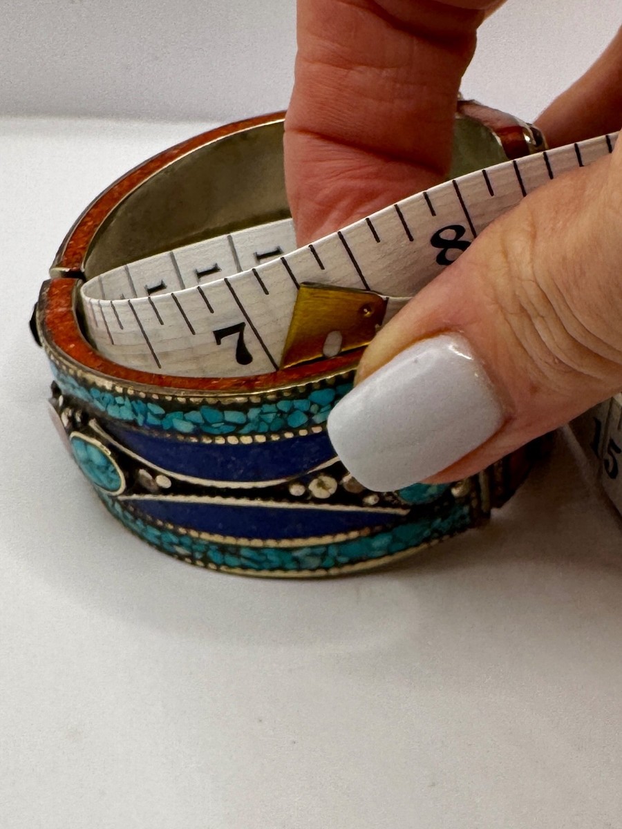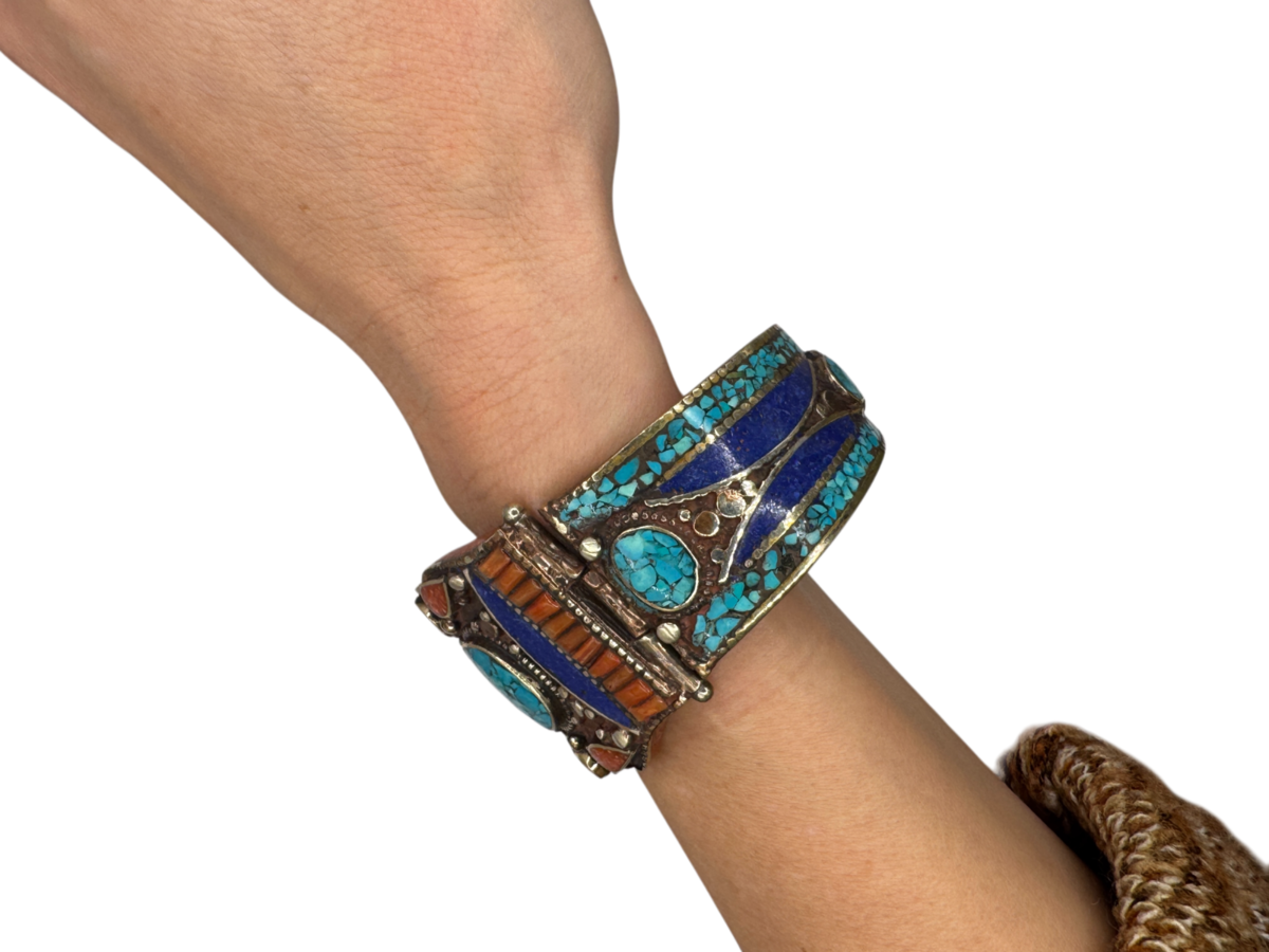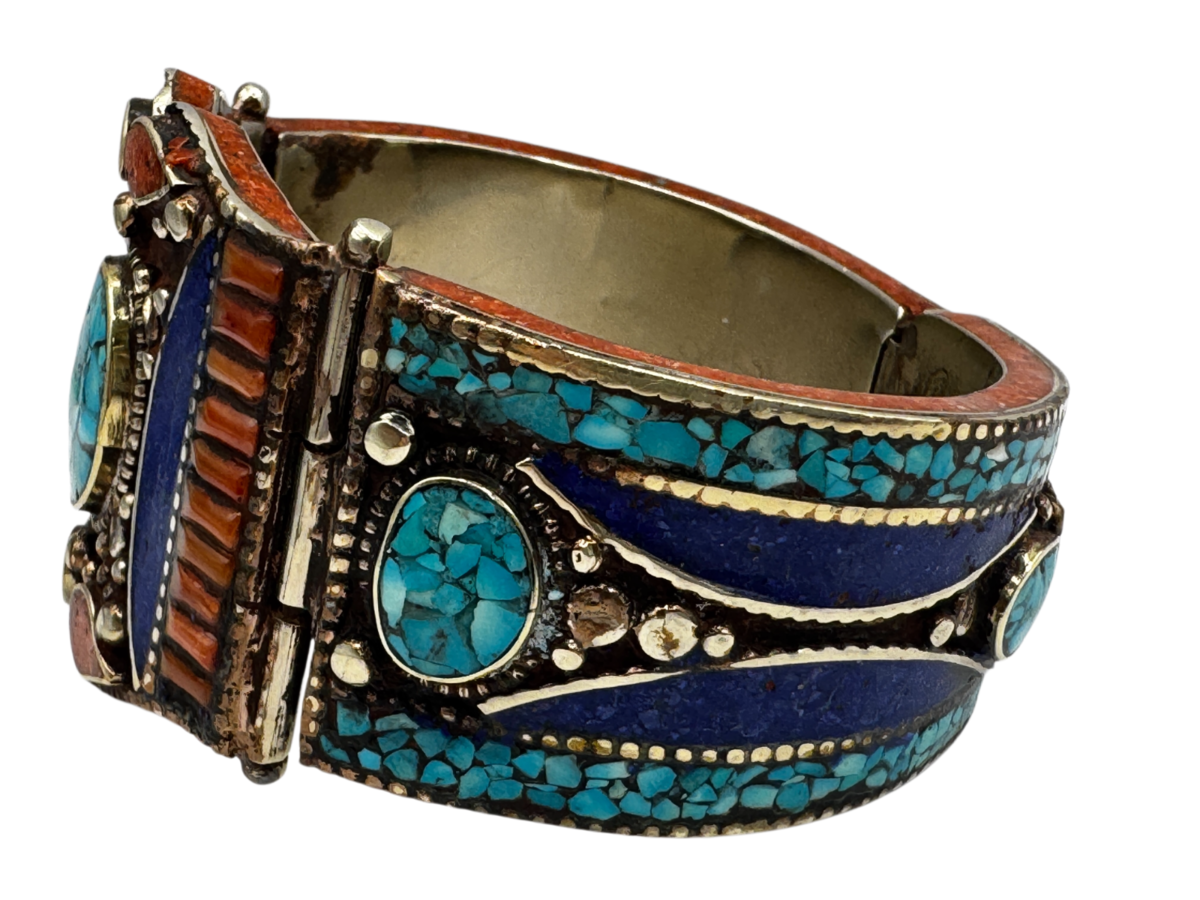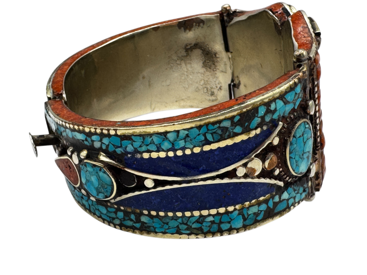 112g Vintage Tibetan Cuff Silver Bracelet Inlaid Turquoise, Coral, and Lapis