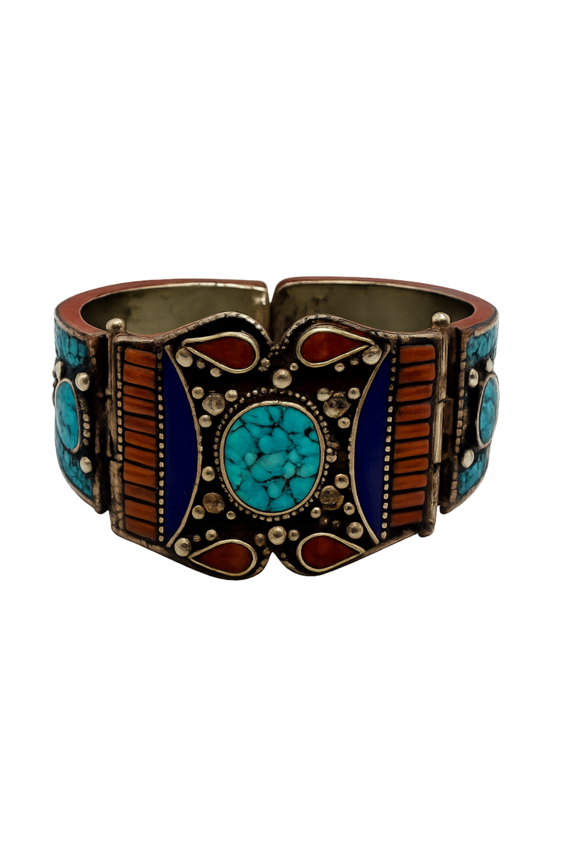This ornate cuff bracelet stands as a striking example of Moroccan craftsmanship. It features bold turquoise, coral, and lapis stones, their veining lending an organic elegance to the bracelet?s structured form. Rectangular coral inlays, set in precise linear patterns, provide a vibrant contrast to the rounded central motifs. Each stone is framed by intricate silverwork, demonstrating masterful use of traditional repousse techniques. The wide band and strong geometric silhouette ensure the piece commands attention, making it a truly remarkable statement accessory.