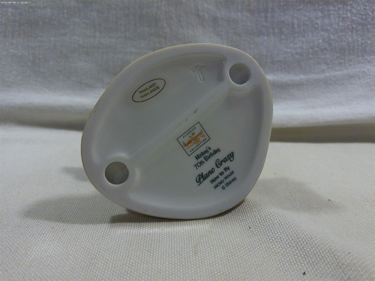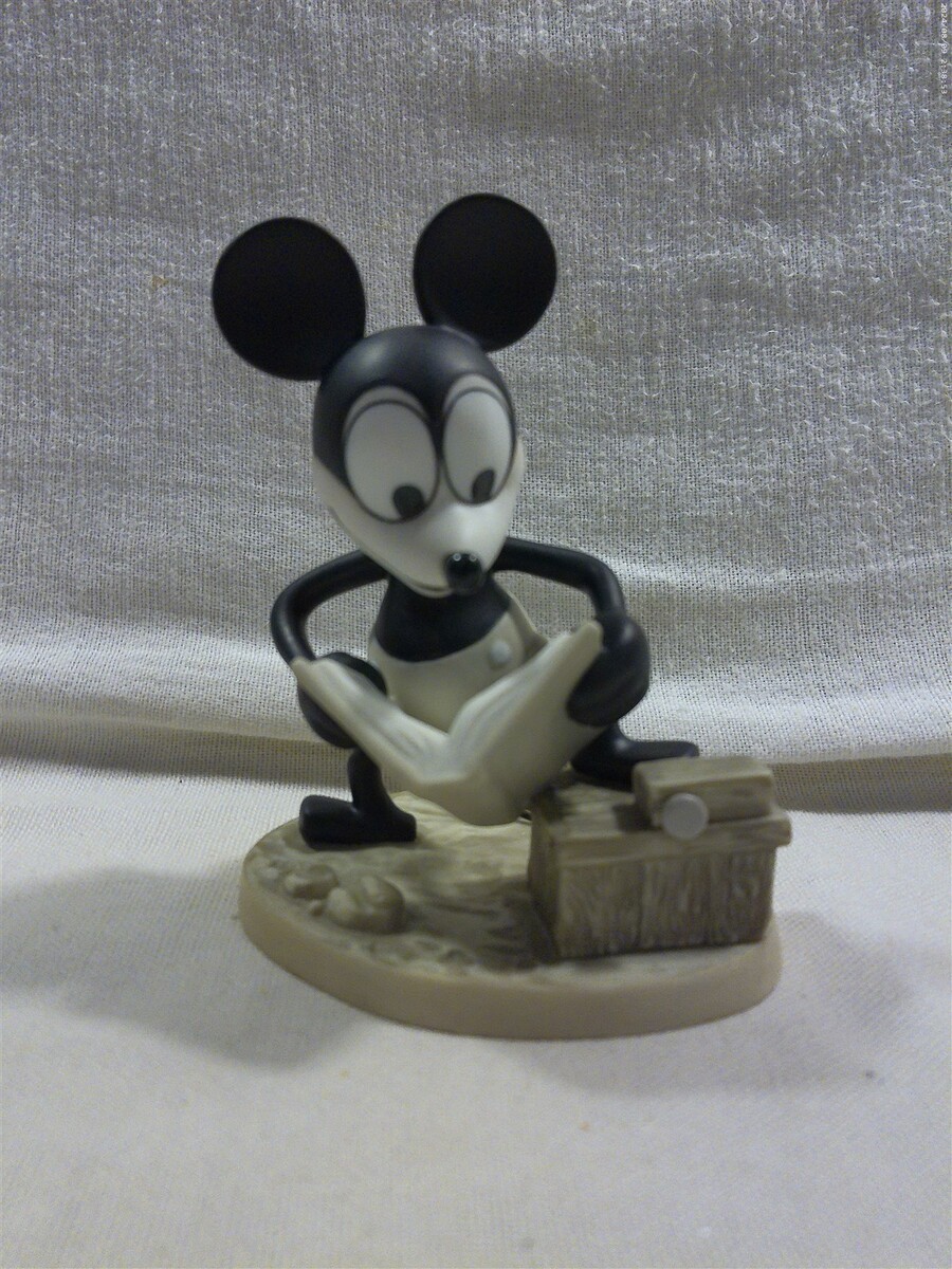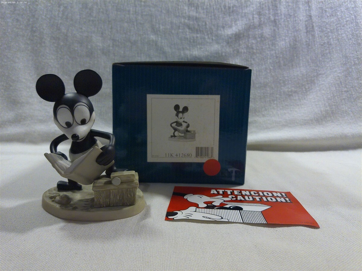This is a Walt Disney Classics Collection (WDCC) Plane Crazy How To Fly Mickey Mouse Ceramic Figurine in original box (11K 412680). The figurine is super cute - Mickey standing reading a book entitled How To Fly. The figurine is marked on the bottom Walt Disney Classics Collection Mickey's 70th Birthday Plane Crazy How to Fly Mickey Mouse Disney. Unfortunately, the original certificate is not included in the box. The figurine measures approximately 4 1/2" tall and 3 3/4" wide - the original box measures approximately 5" tall and 7 1/2" wide. Super clean cute Walt Disney Classics Collection How to Fly Mickey Mouse ceramic figurine in original box that displays absolutely great when sitting on a shelf!