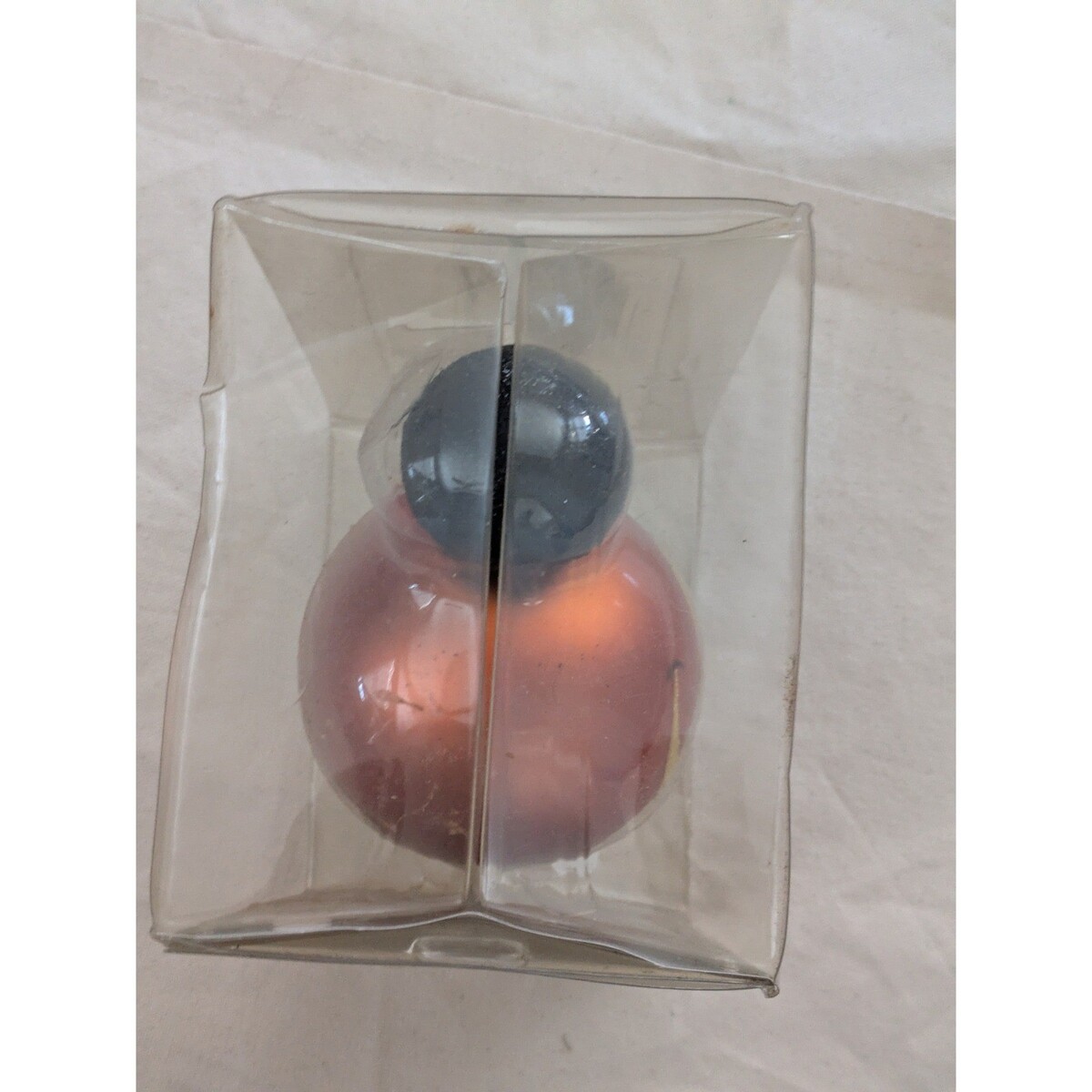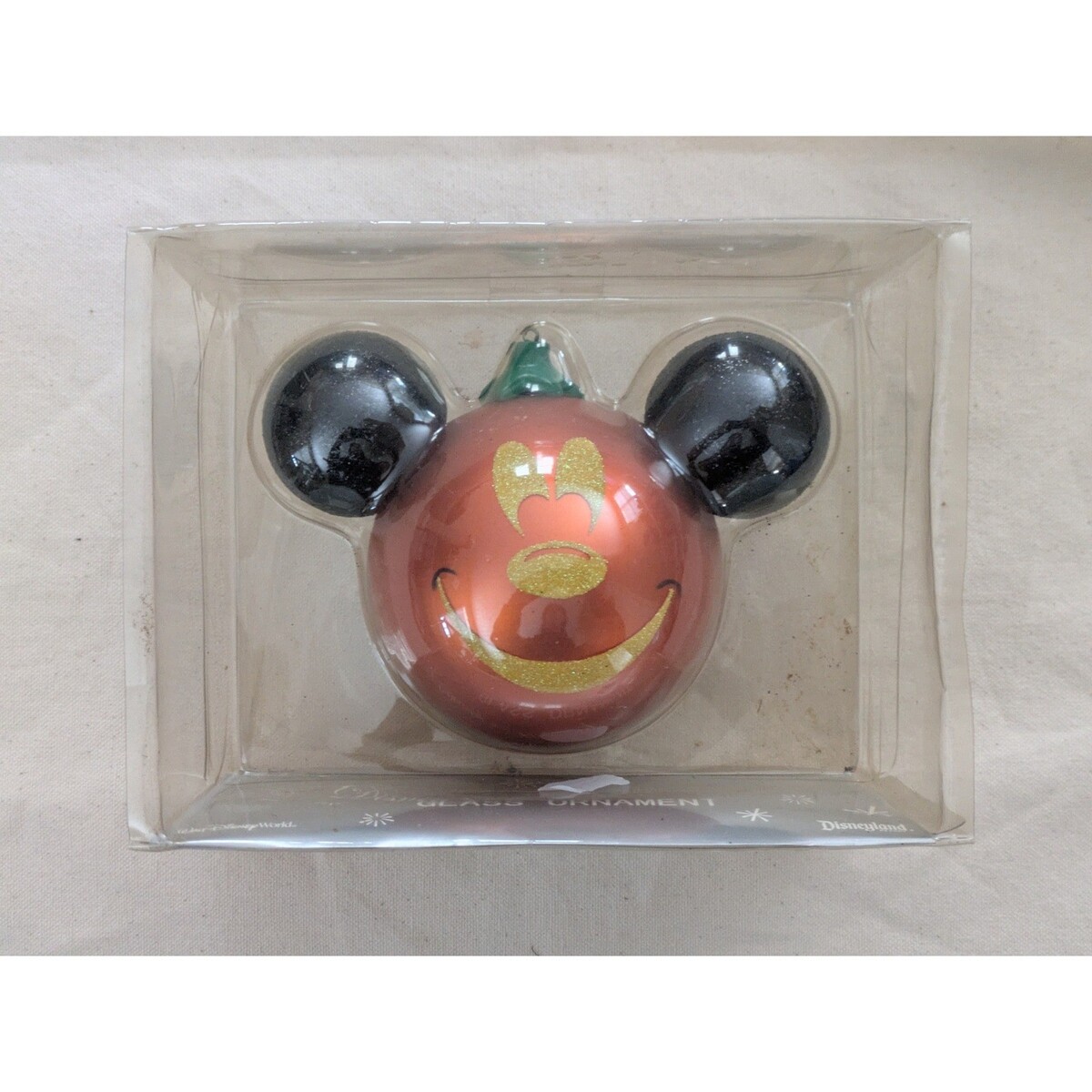Disney Parks Mickey Mouse Pumpkin Halloween ornament brings a touch of spooky magic to your holiday decor. This glass-style bauble features the iconic Mickey silhouette transformed into a festive jack-o'-lantern with a metallic orange finish and glittery gold facial details. Topped with a green stem and finished with black glittery ears, it captures the whimsical spirit of a Disney Halloween. The ornament comes in its original plastic storage container, though the packaging shows some wear and dust from storage. Perfect for collectors of Disney theme park holiday memorabilia.