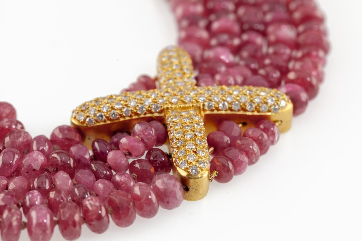 Features 5 Rows of Briolette-Cut Ruby Beads Interspersed with 18k Yellow Matte Gold Spacers and X Motifs
