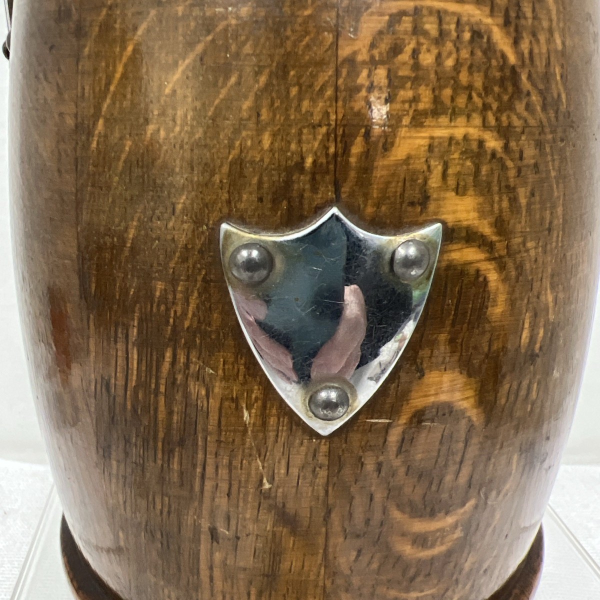 Antique English Dark Oak Shield Crest Porcelain Liner Biscuit Barrel Lid Handle