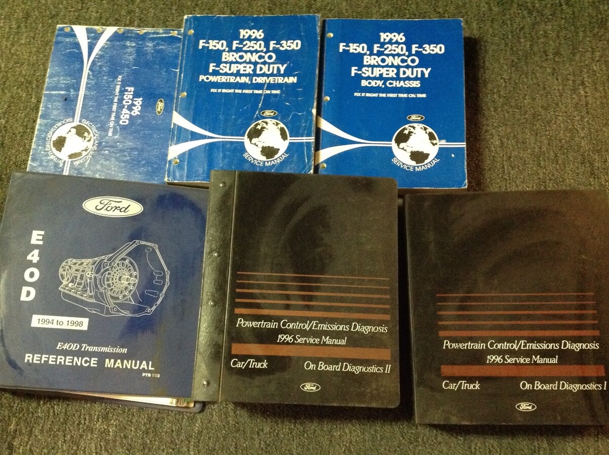 Factory 1996 Ford F-150/250/350/BRONCO/F-Super Duty Powertrain/Drivetrain Service Manual, Body/Chassis Service Manual, Electrical and Vacuum Troubleshooting Manual,Transmission Reference Manual, Powertrain Control Emissions Diagnosis Manual