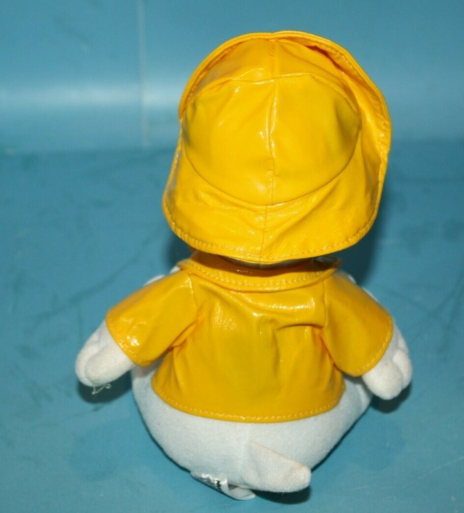 Features: Soft thin plush material, Wearing a yellow thin vinyl rain coat and hat. Rain coat is removable, but hat is not. Plush eyes and nose.