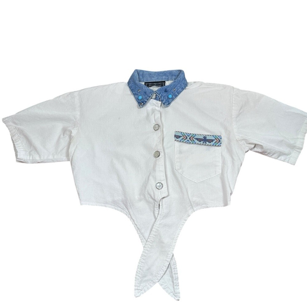 Vintage Southwestern Crop Top Pearl Button Collared Tie Waist Size Small