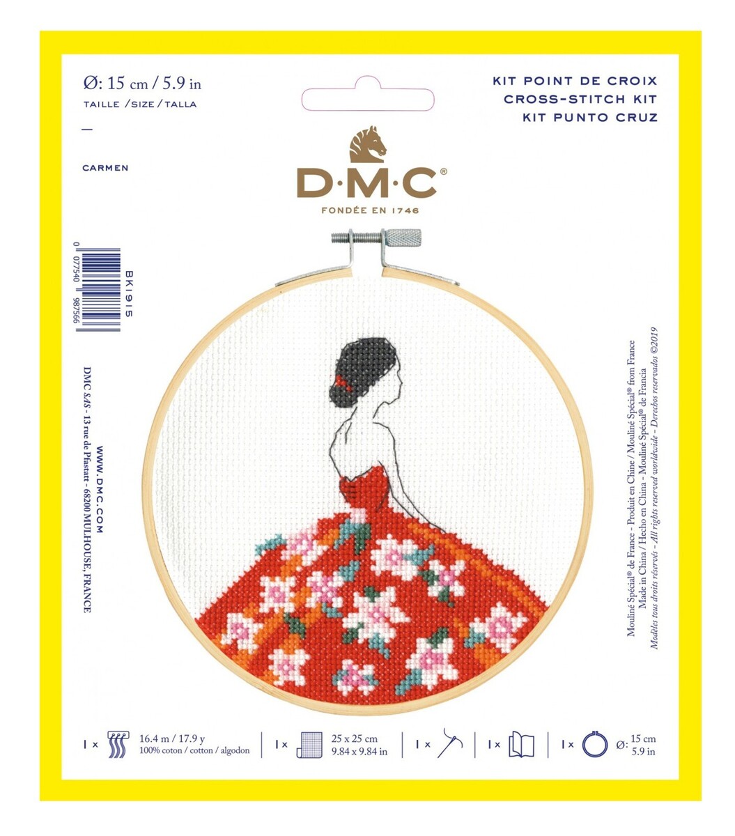 DMC Beginners Cross Stitch Kit XS Carmen BK1915L. A beginner?s dream, this little kit brings BIG value. The DMC Stitch Kit Collection provides all you need to make this inspired design your own. Kit Includes Everything You Need: 9.8in x 9.8in (25 x 25 cm) 14 Count - 100 Percent Cotton, Aida Cloth, 6in. Bamboo Hoop, DMC Embroidery Floss, Tapestry Needle, and Complete Instructions. Design features: A female wearing a red dress covered in pink flowers. Finished Size: 9.8 inches x 9.8 inches CHK-BK1915L