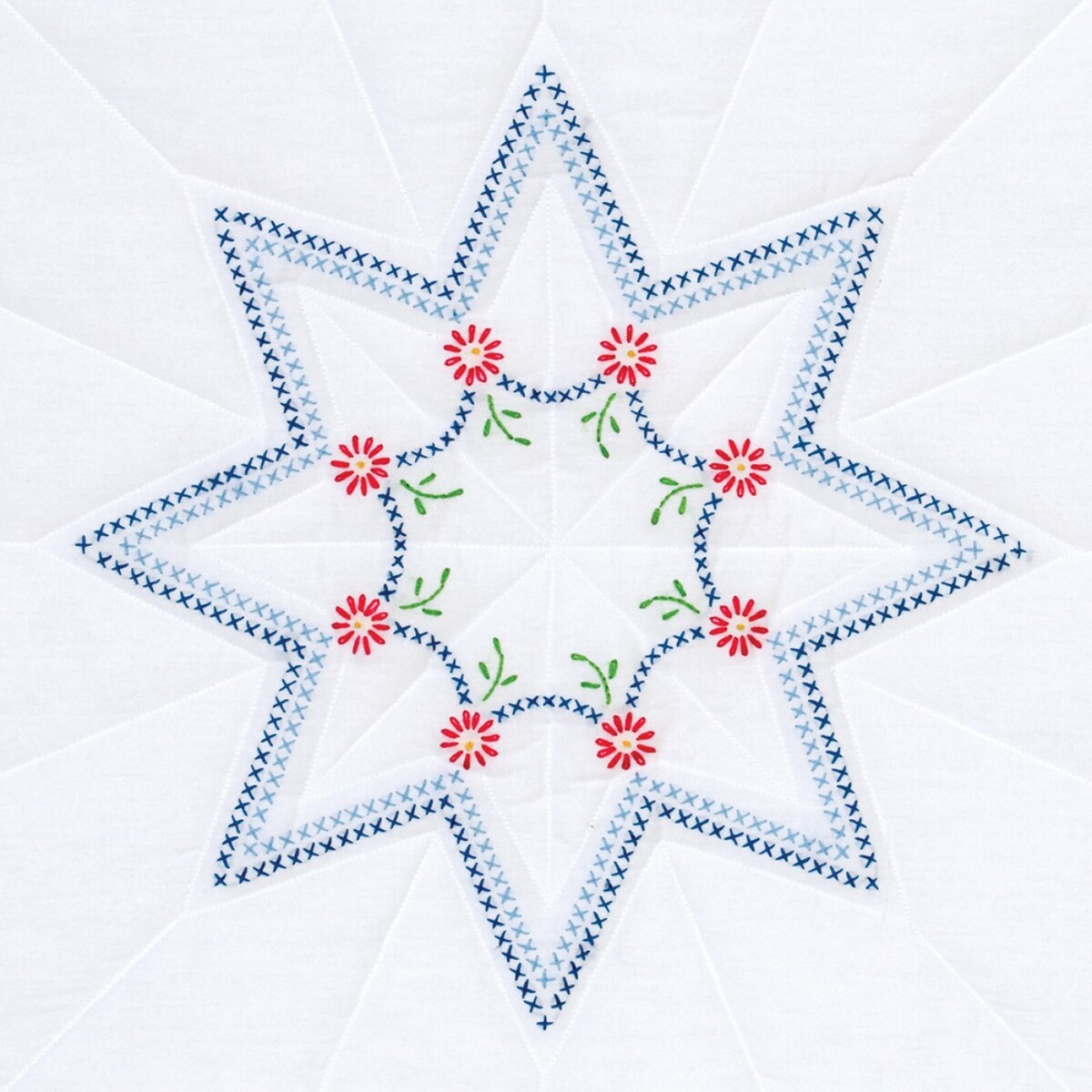 Jack Dempsey Needle Art Star 18 Inch Quilt Blocks. Stamped for Cross-Stitch and Embroidery. Star Design. Contents: Six 18 inch x 18 inch quilt blocks of cotton/poly broadcloth with easy to follow instructions. Ink washes out. Approximate requirements: Twin - 3 packages, Full 4 packages, Queen - 5 packages, King - 5 packages. 100 Percent made in the U.S.A. Item Number: 732-32. CHK-732-32