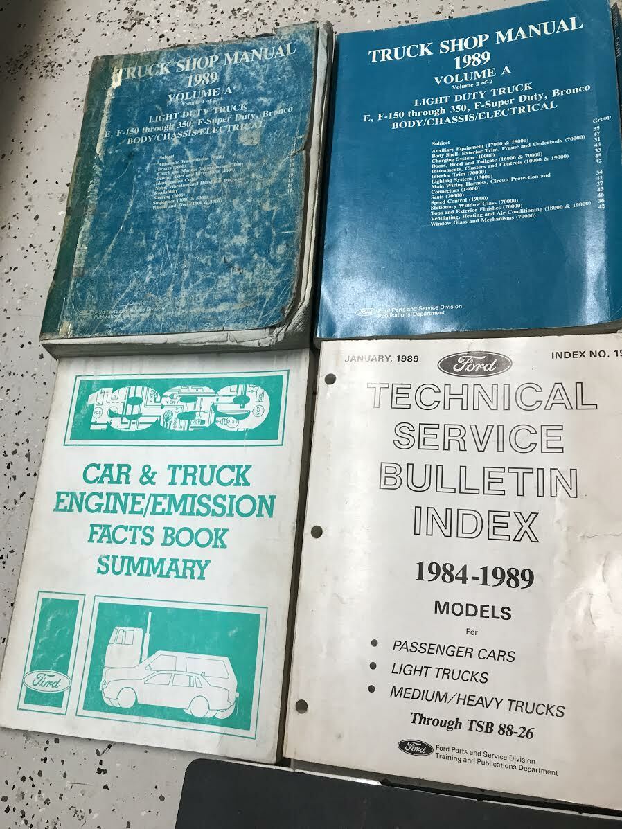 Factory 1989 Ford F-150/250/350/BRONCO/F-Super Duty/Econoline, BODY/CHASSIS/ELECTRICAL SERVICE MANUALS/ENGINE SERVICE MANUAL, POWERTRAIN EMISSION CONTROL DIAGNOSIS MANUAL, PRE DELIVERY MANUAL,WIRING DIAGRAM MANUALS, POWERTRAIN CONTROL EMISSIONS DIAGNOSIS MANUAL, FACTS BOOK MANUAL, TECHNICAL BULLETIN INDEX