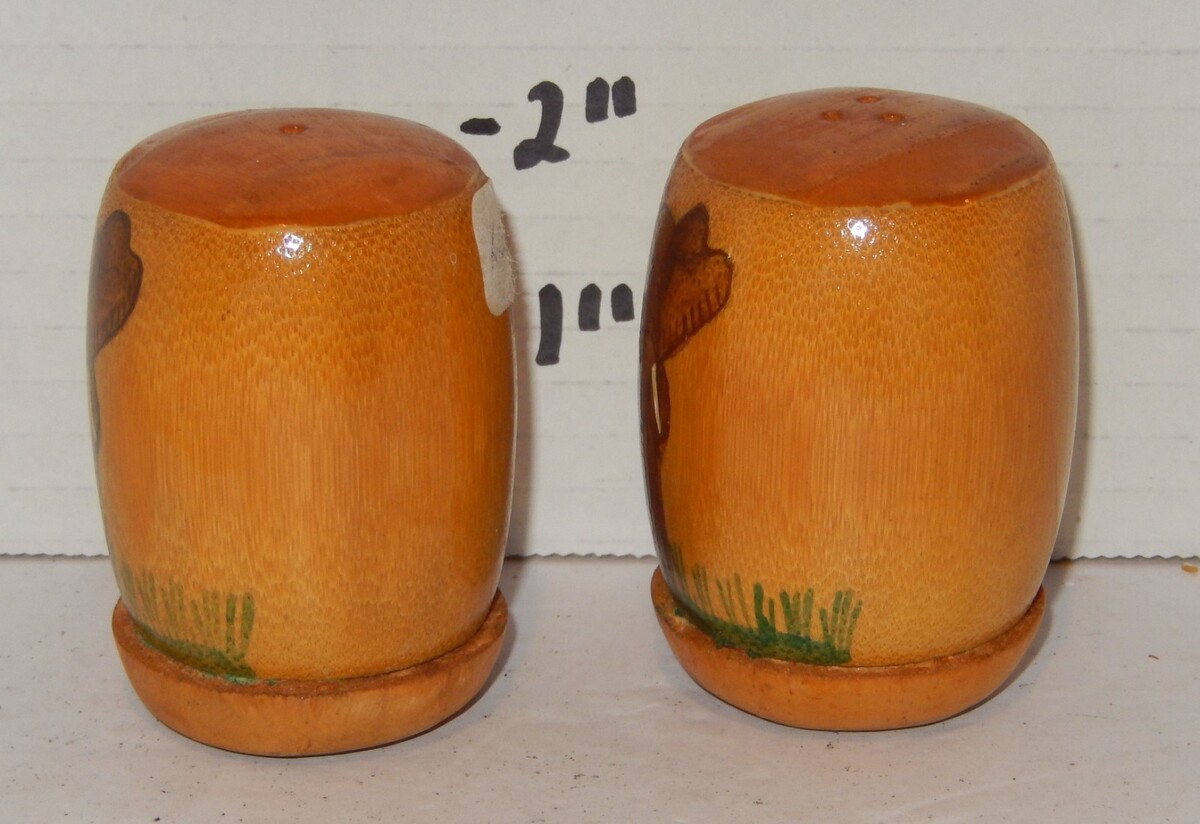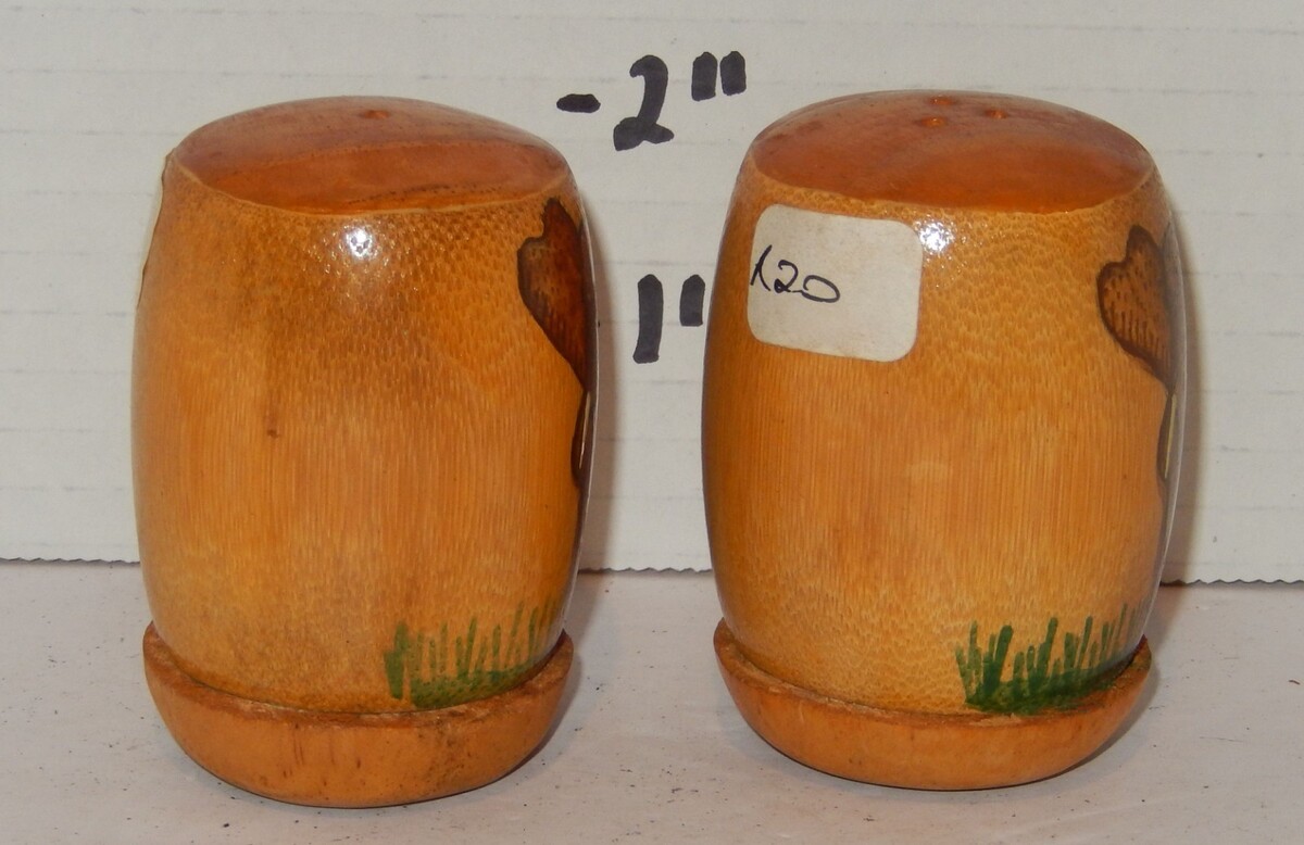 These shakers are in good vintage condition. Please note there are price stickers/residue on the sides from a previous owner (as seen in photos), which could likely be removed with a gentle cleaning. No visible cracks or major chips.