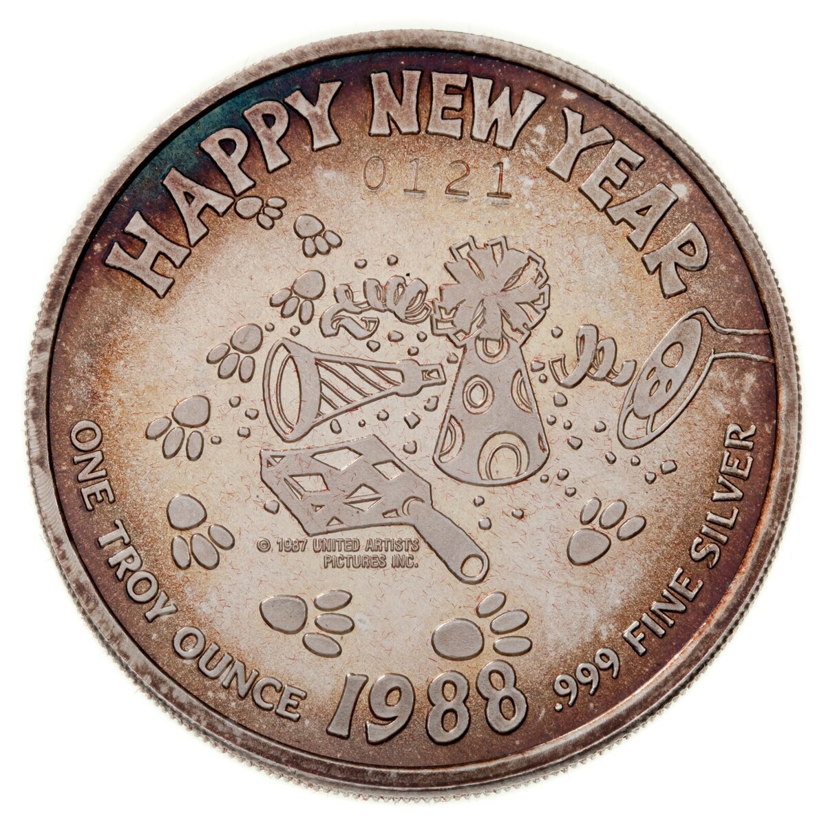 Pantera Rosa 1987 Buon Natale 1988 Felice Anno Nuovo 1 oz. Vernice smaltata argento