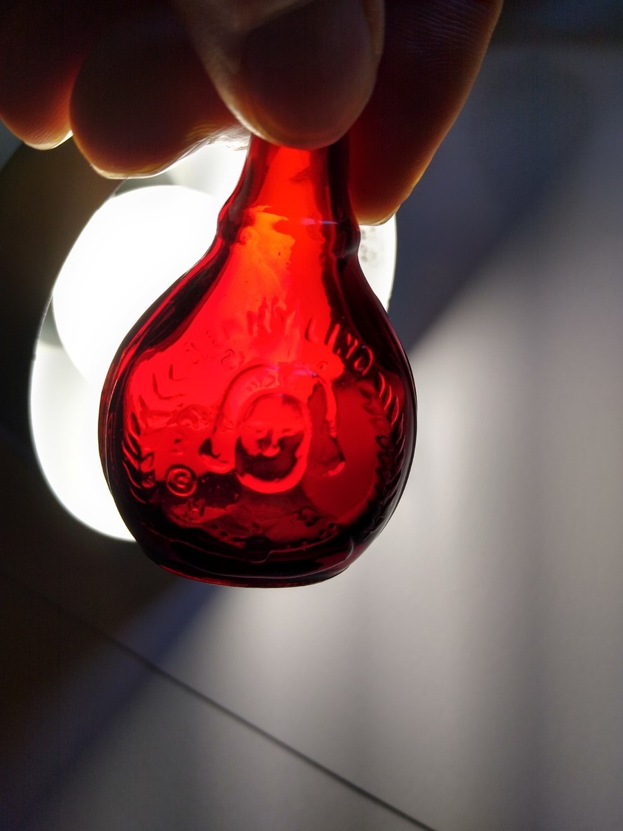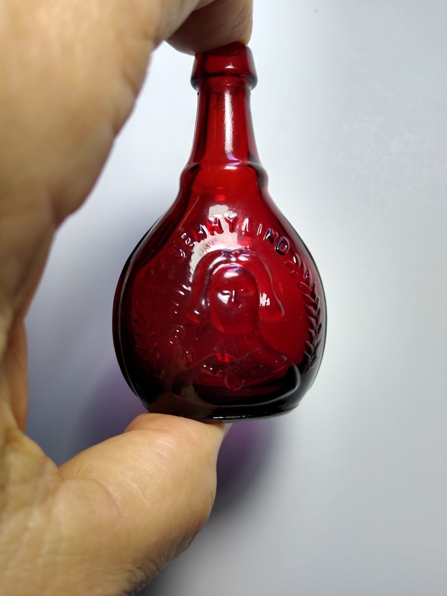 The product is a reproduction Wheaton Ruby Red Carnival Glass Bottle in the style of the Jenny Lind medicine bottle from the 1970s. Made in the United States, this mini 3" bottle captures the vibrant red color and unique design of the original collectible. Perfect for collectors or enthusiasts of vintage bottles, this reproduction piece stays true to the original subject and craftsmanship, making it a desirable addition to any collection. Nice condition.