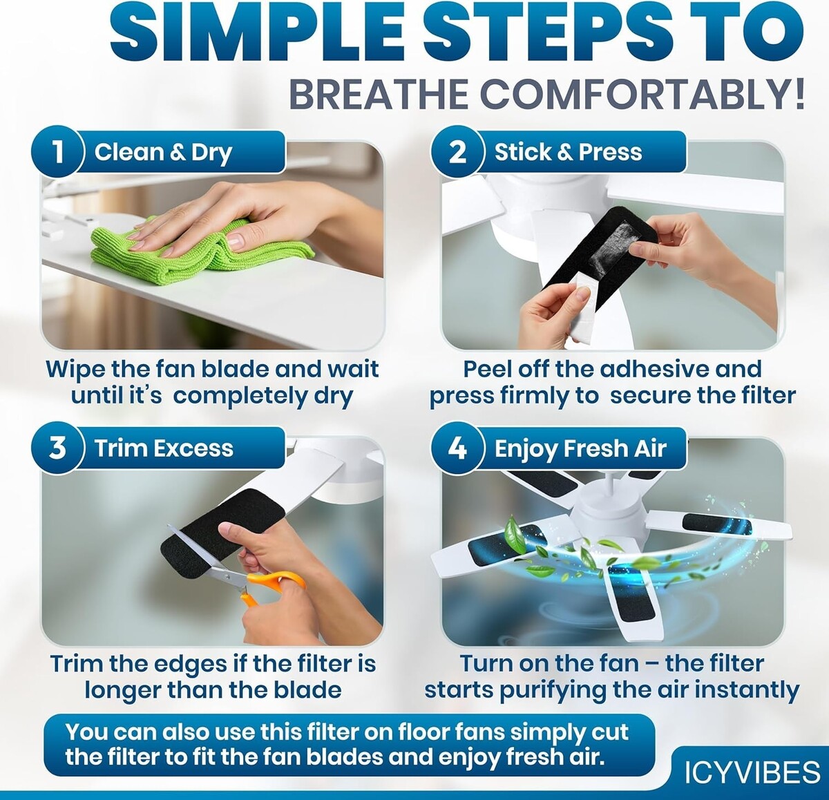 Invisible Protection Layer: Forms a discreet layer on fan blades that continually traps pollutants without affecting fan aesthetics or speed.