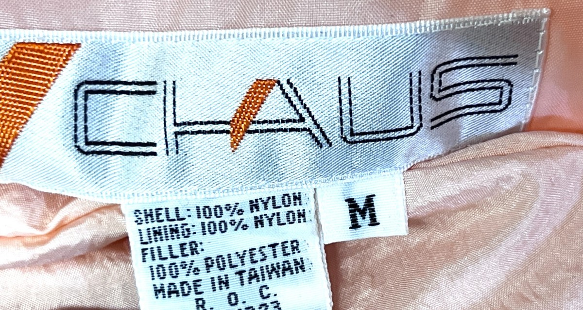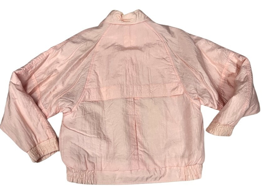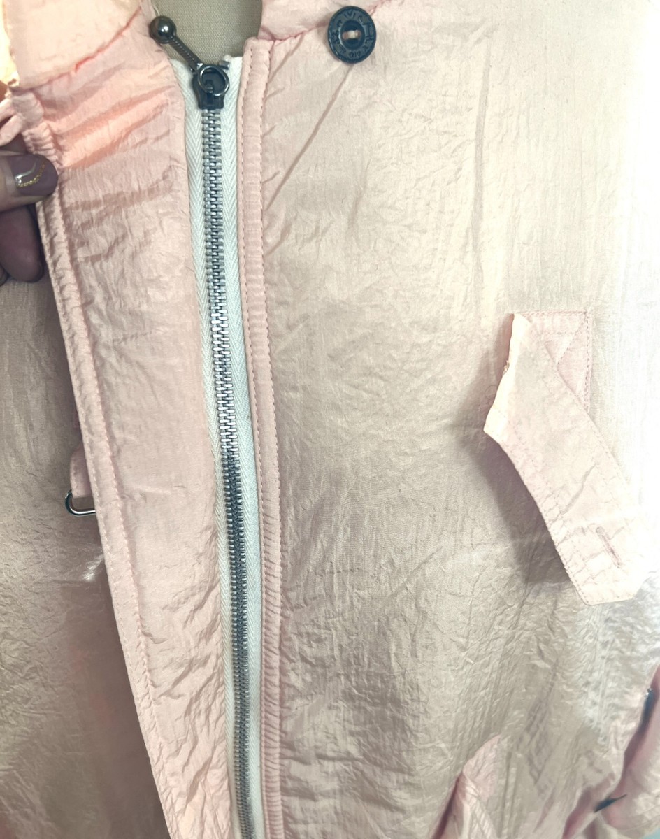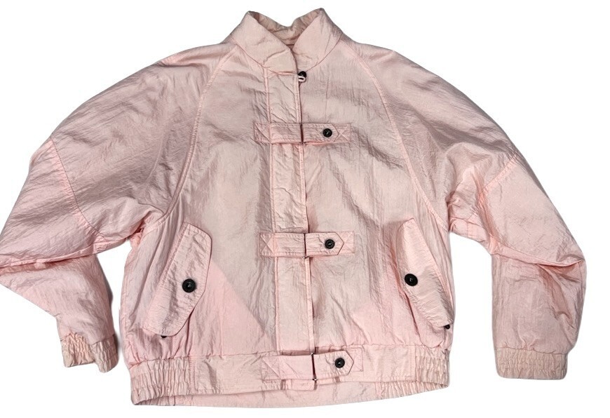 Jacket: Lightweight crinkle nylon shell with polyester fill, giving a slightly puffy silhouette (not as heavy as modern down). Front zip and buckle closure, flap zippered pockets, elastic waistband + cuffs.