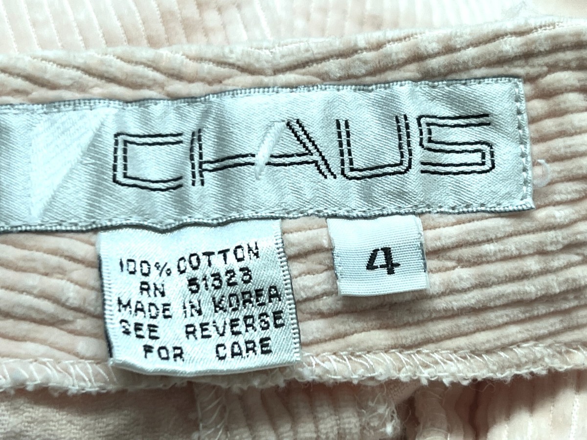 Pants: Peach corduroy ski pants, marked size 4, with zippered pockets, tapered legs, and removable stirrup/elastic cuffs.