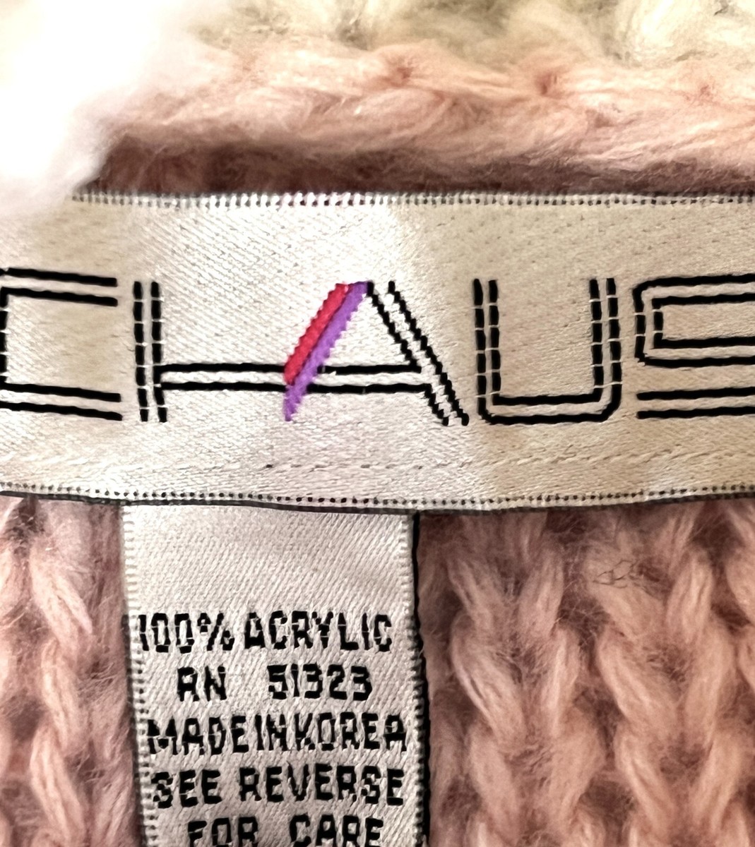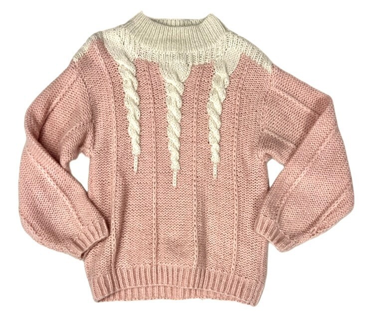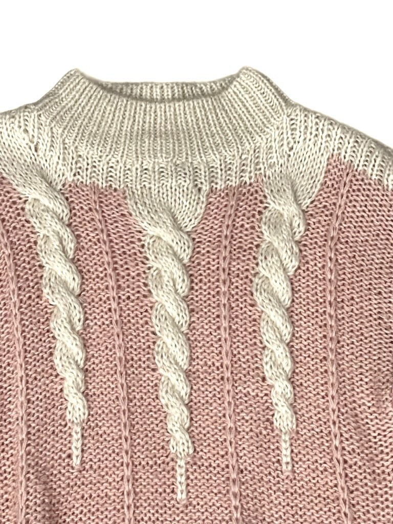Sweater: Oversized cable-knit pullover in peach and cream acrylic, marked size Small but with roomy 80s fit.