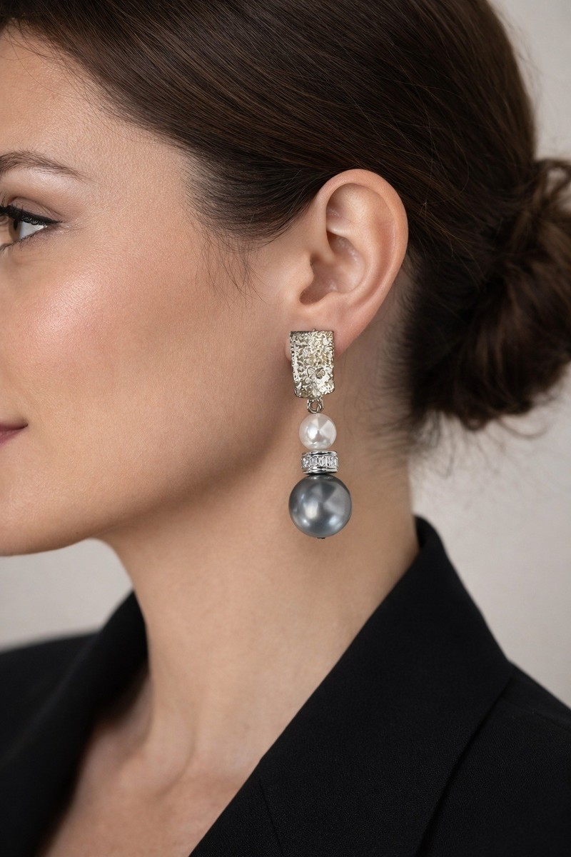Elegant vintage-style clip-on earrings featuring a bold two-tone faux pearl drop design. The textured silver-tone rectangular tops add a modernist touch, while the graduated pearl beads give a classic, timeless look. These are comfortable clip-ons, perfect for non-pierced ears and ideal for both dressy occasions and everyday vintage styling.