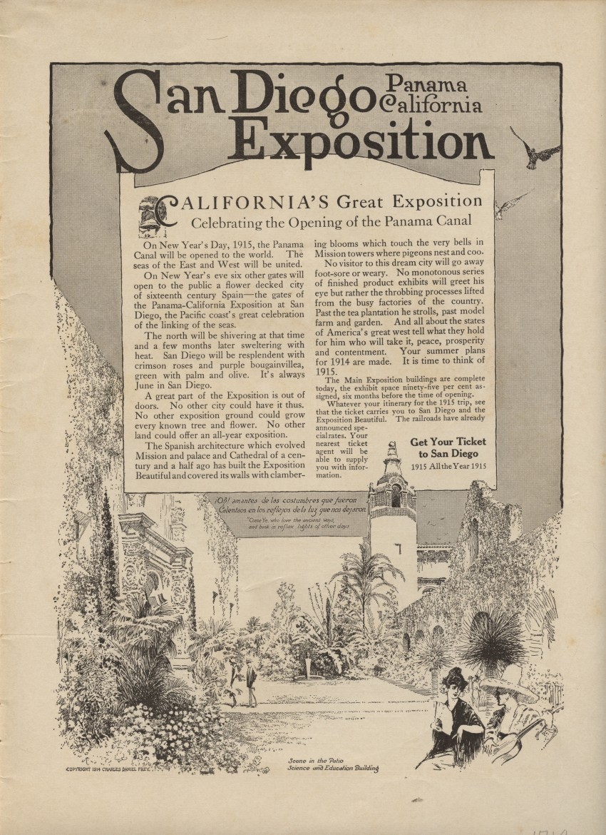 A 2 sided single page ad removed from a magazine. Measures about 9" x 12". 1914 Coca Cola , A Man's Drink, A Woman's Drink, Everybody's Drink. ad on one side and San Diego Panama California Exposition Magazine Ad on the other side.