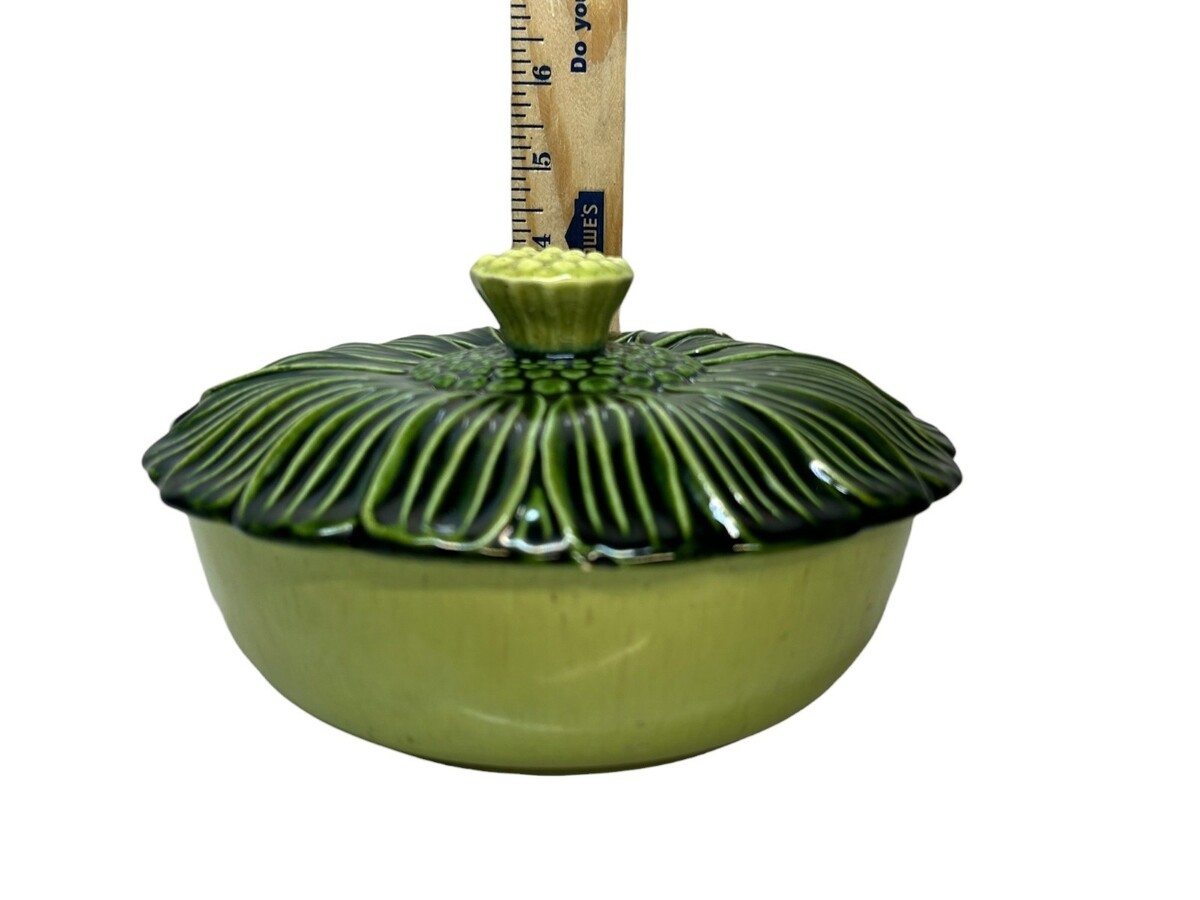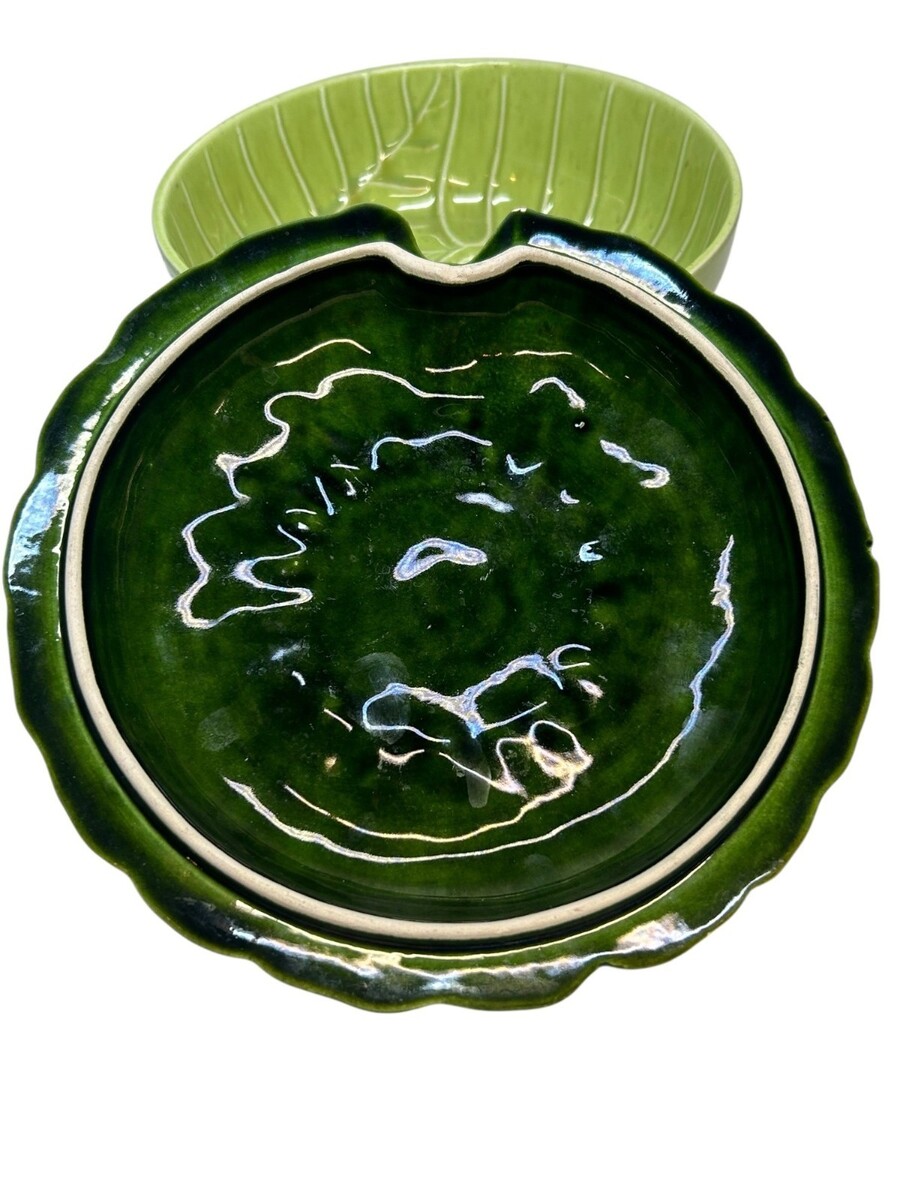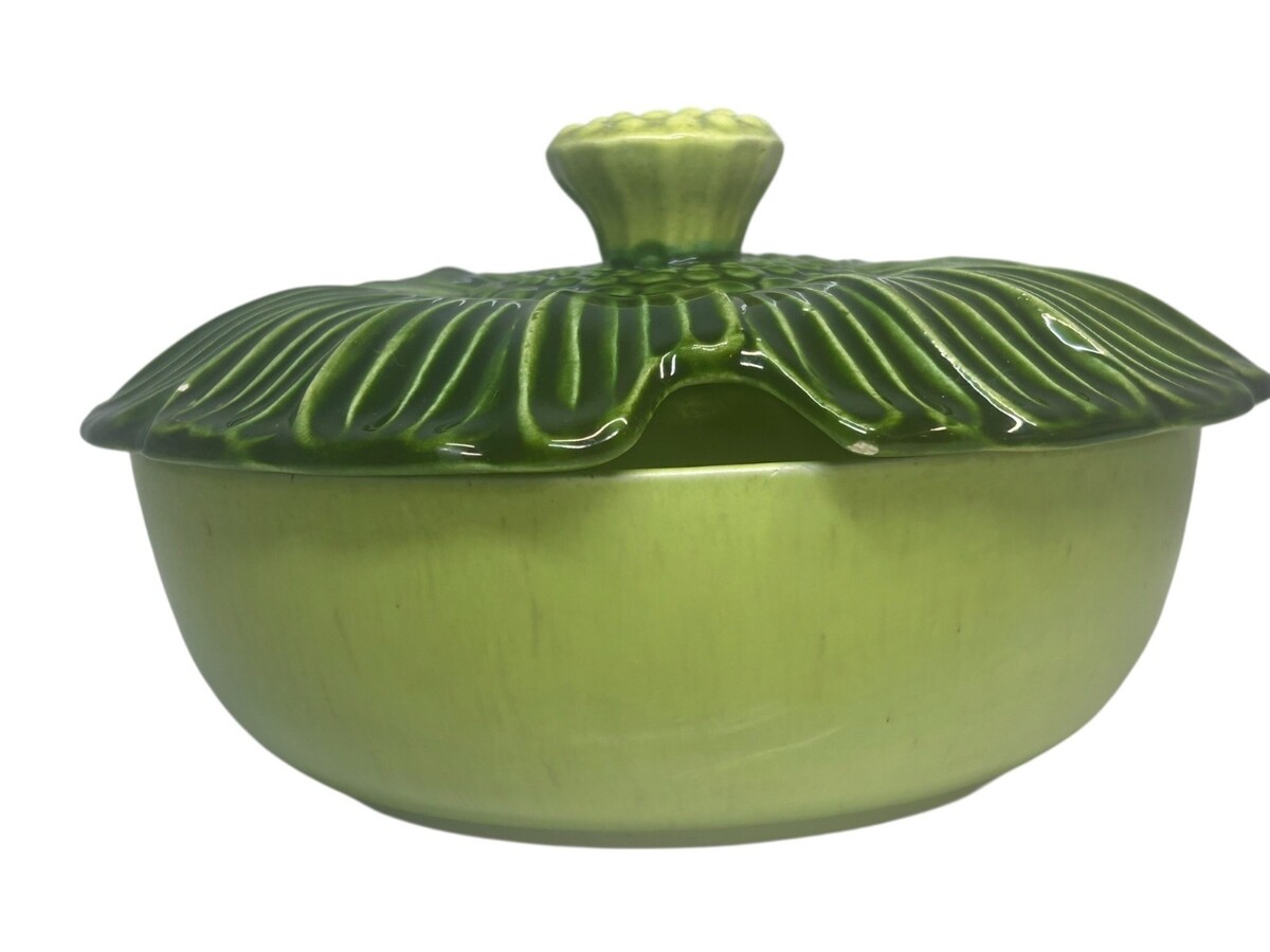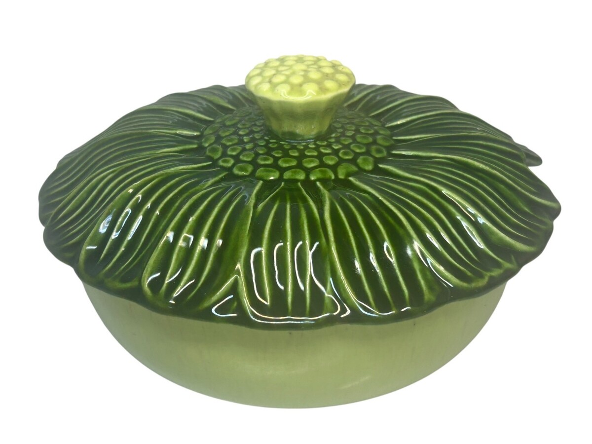 Vintage Green Ceramic Flower-Cabbage Shaped Lidded Bowl Cabbage Leaf Interior