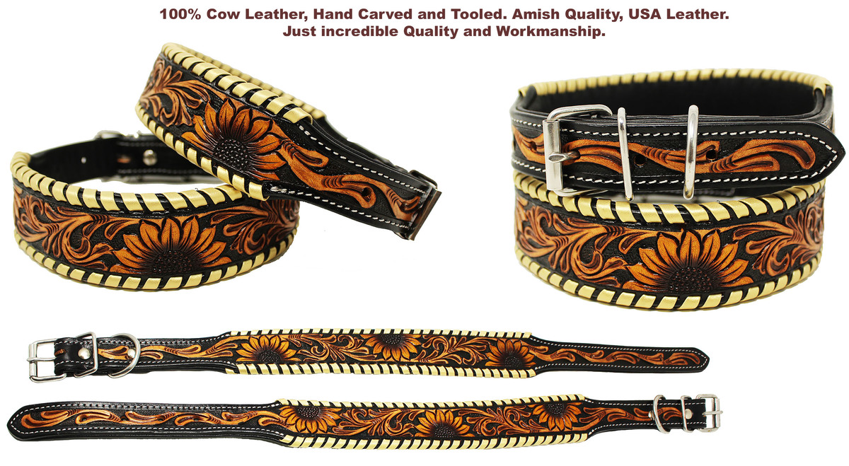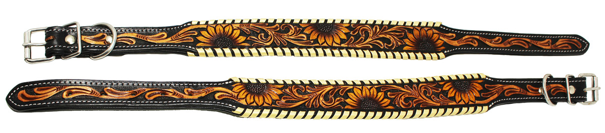 Challenger genuine handmade full grain leather heavy-duty dog collar comes fully padded for comfort. Collar is accented with a hand-tooled floral inlay. Rust-free stainless steel hardware.
