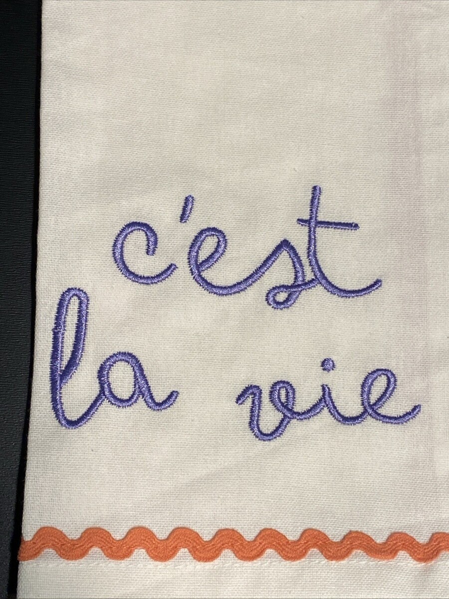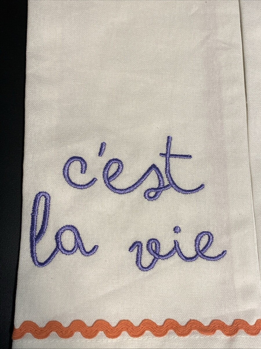 This retro-cool stylized novelty Kitchen Set of 2 tea towels features a periwinkle embroidered saying ?C?est la vie? (iconic French phrase for ?that's life? or "such is life?) with pink - peach trim. The towels are 100% cotton. The set is easy to care for as can be machine washed in cold.