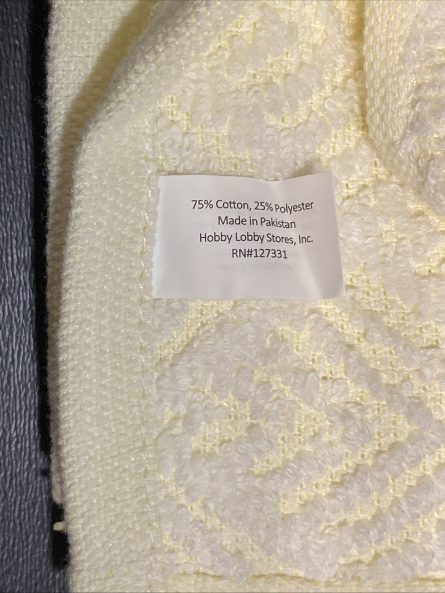 This retro-cool stylized novelty Kitchen or Bathroom Set of 4 hand or dish towels in two shades of light yellow. The towels are 100% cotton and nice and thick. The set is easy to care for as can be machine washed in cold.