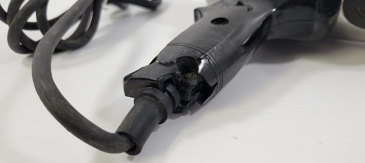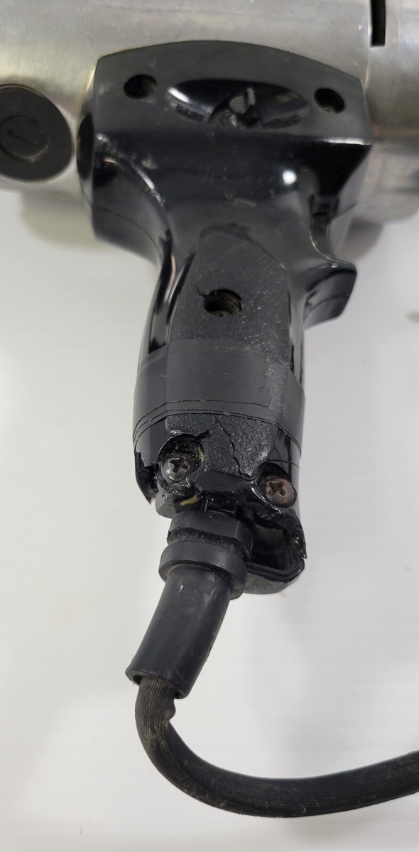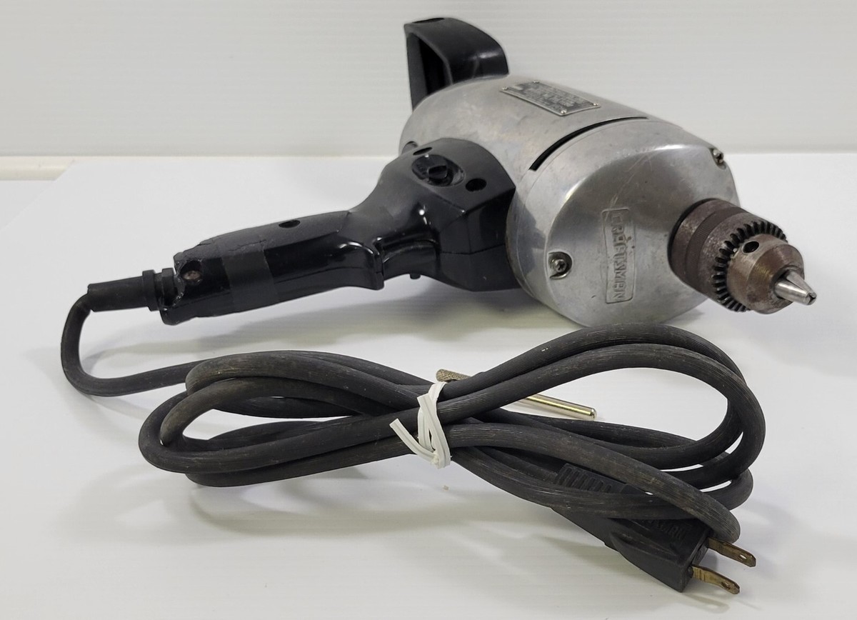 Drill is in vintage used condition with signs of use, age and storage. The plastic handle is cracked and has a taped repair. The chuck is a little tough to tighten and loosen due to time in storage. It was lightly lubricated prior to listing and does work but is still a bit tough. The drill is in good working condition. Only what is pictured is included.