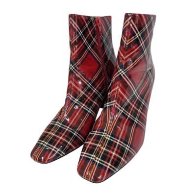 Betsey Johnson Regie Red Tartan Plaid Boots Booties Sz 6.5 Wet Look Chunky Heel
