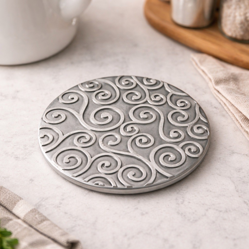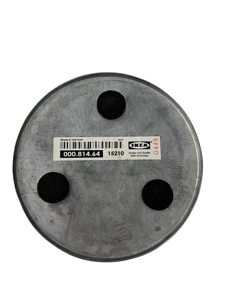 Stylish IKEA metal trivet featuring an elegant raised swirl pattern in a silver-tone finish. Designed to protect surfaces from heat while adding a modern decorative touch, this compact 5-inch trivet is perfect for small pots, teapots, or serving dishes. Functional and minimal with a contemporary Scandinavian look.