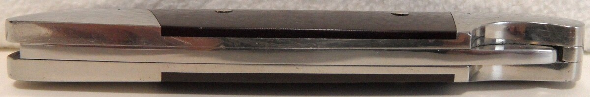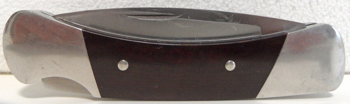 (1) Stainless (Tang mark) Lock Back Knife, 3-1/4" closed, 5-1/4" open straight blade. Brass, Wood scales, blade slightly wobbles, unknown maker unless "Stainless" is a maker?.