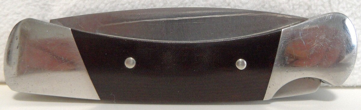(1) Frontier Double Eagle Liner Lock Knife - 4615 USA Imperial Stainless - 1976-85 - Rosewood scales, brass bolsters. 5.3" closed, 9-1/4" open. Frontier double eagle stamped on blade. Blade and liner lock are tight and no wobbles, sharpened blade, rosewood scales need a couple pins but still tight.