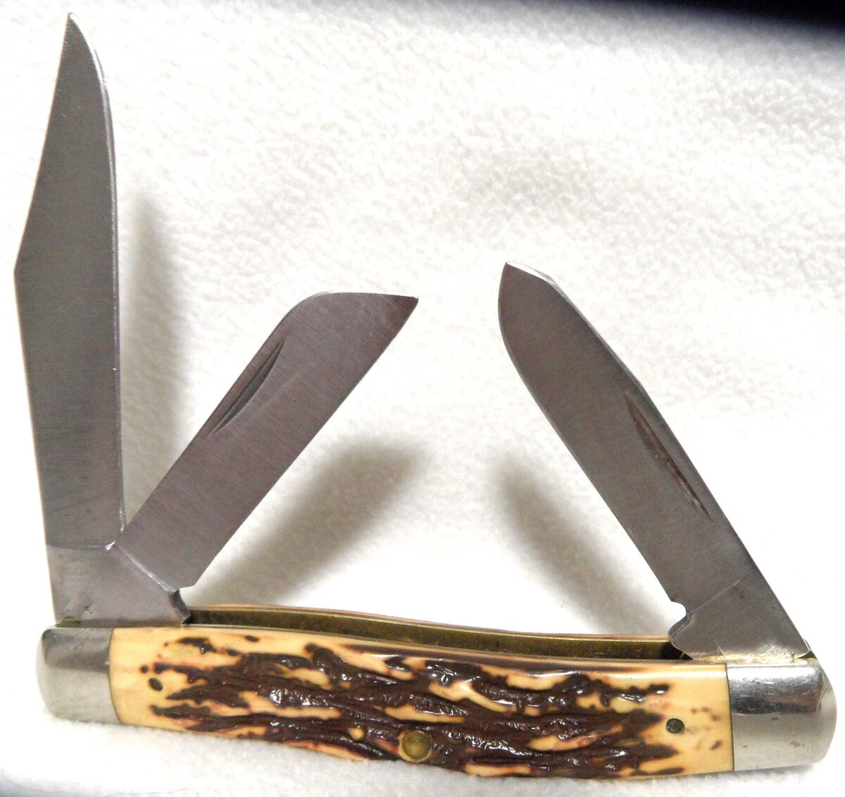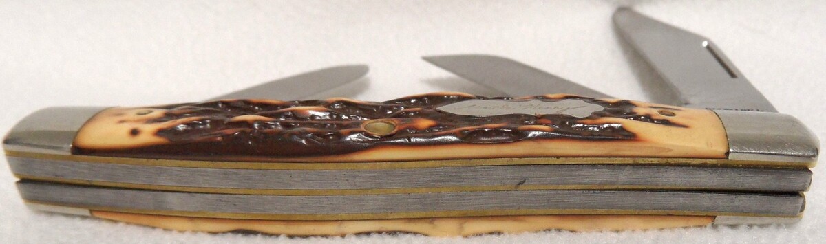 (1) Uncle Henry King Ranch Stockman - Schrade+ USA 885UH - 1970-83, nickel silver bolsters, uncle Henry glimp shield, staglon handles. Blades are tight, features 3 blades folding, clip sheepfoot sprey. 4" closed.