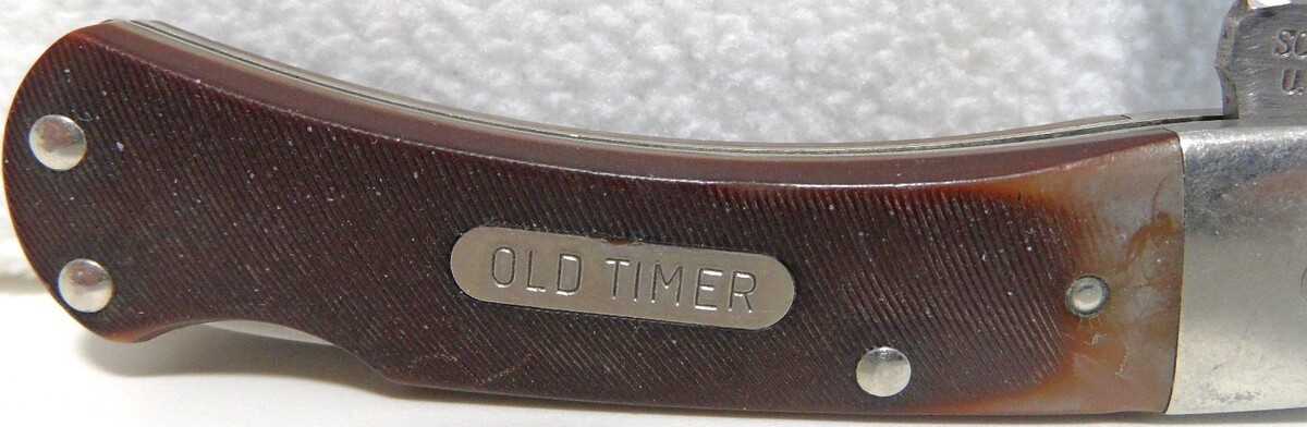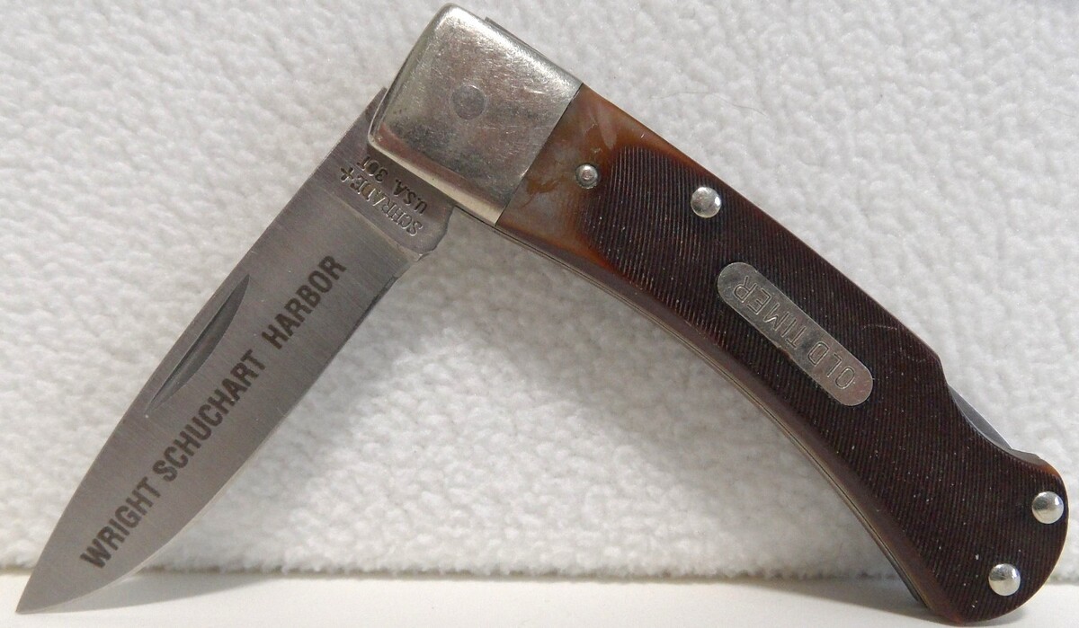 (1) Old Timer Schrade+ USA 30T - 1986-2004, bear-head edge saw cut derlin handles, Lock back blade, inscribed "Wright Schuchart Harbor, blade is tight, no wobble. 3 inch closed, 5-1/8" open.