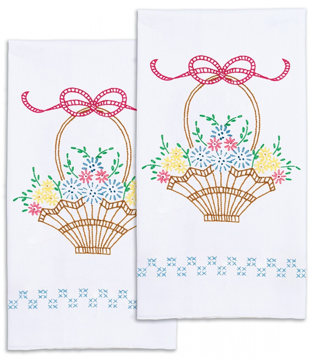 Jack Dempsey Needle Art Basket of Flowers Decorative Hand Towels. Basket of Flowers. Stamped for Cross-Stitch and Embroidery. Package contains two matching - 17 inch x 28 inch decorative hand towels. Made of cotton/poly broadcloth, with easy to follow instructions. Ink washes out. 100 Percent made in the U.S.A. Item Number: 320-121. CHK-320-121