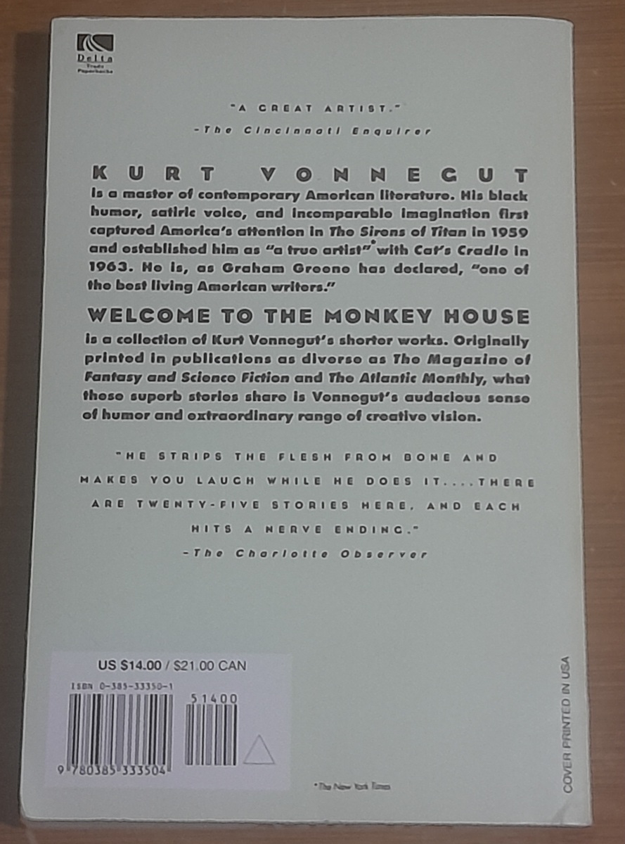 I am selling a vintage trade paperback copy of the book WELCOME TO THE MONKEY HOUSE by legendary author Kurt Vonnegut. The book is a collection of short stories written by Vonnegut during the 1950s and the 1960s that run the gamut from war stories to science fiction to social satire and black comedy. Among the stories included are "Report on the Barnhouse Effect", "Harrison Bergeron","Who Am I This Time?" and the title story. The book has some light wear, but still remains in very good condition. The book was previously owned by someone else, so there's a name written on the bottom of the pages, but that's it in terms of markings. All pages are still clear, firm, and readable, but have slightly yellowed.