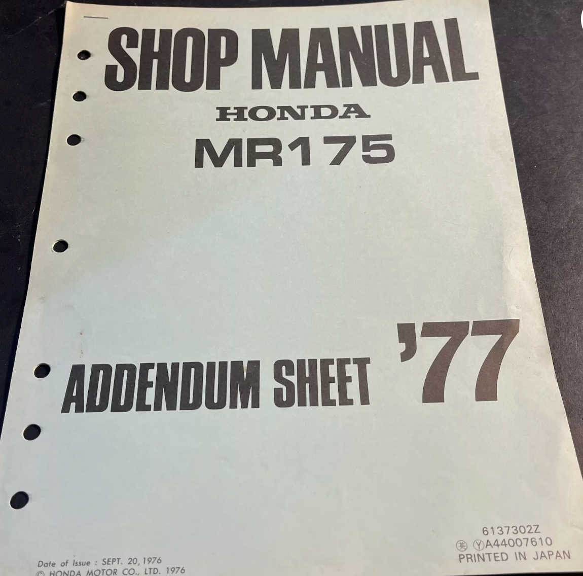 Shop Manual Honda MR175 Addendum Sheet 6137302Z OEM