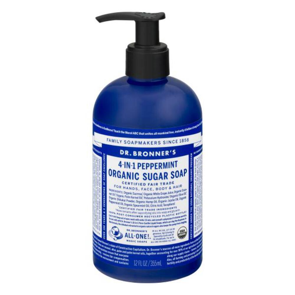 Experience the invigorating freshness of Dr. Bronner's 4-in-1 Peppermint Organic Sugar Soap, a versatile and eco-conscious choice for your daily cleansing routine. Certified Fair Trade: Ensures ethical sourcing and supports fair labor practices. 4-in-1 Formula: Cleanses hands, face, body, and hair with a single product. Organic Ingredients: Made with organic sucrose and white grape juice for gentle cleansing. Refreshing Peppermint: Provides a cooling and stimulating sensation. Recycled Packaging: Comes in a 100% post-consumer recycled plastic bottle. Dr. Bronner's 4-in-1 Peppermint Organic Sugar Soap offers a refreshing and environmentally friendly way to cleanse your entire body. With its blend of organic ingredients and invigorating peppermint, it's perfect for those seeking a sustainable and multi-purpose soap. This soap is designed to leave your skin feeling clean, refreshed, and lightly scented, while also contributing to a healthier planet through its recycled packaging and fair trade practices. Technical Specifications: Volume: 12 FL OZ / 355ml Ingredients: Organic Sucrose, Organic White Grape Juice, Organic Coconut Oil, etc. Bottle Material: 100% Post-Consumer Recycled Plastic