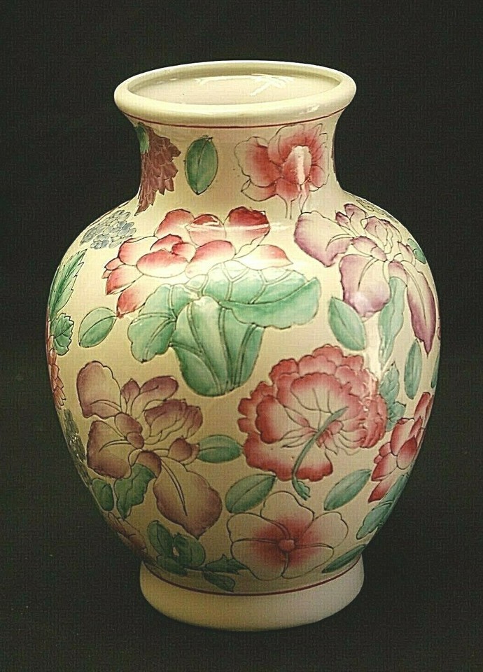 Vintage Style 12" Chinese Porcelain Vase Hand Painted Floral Pastel Colors