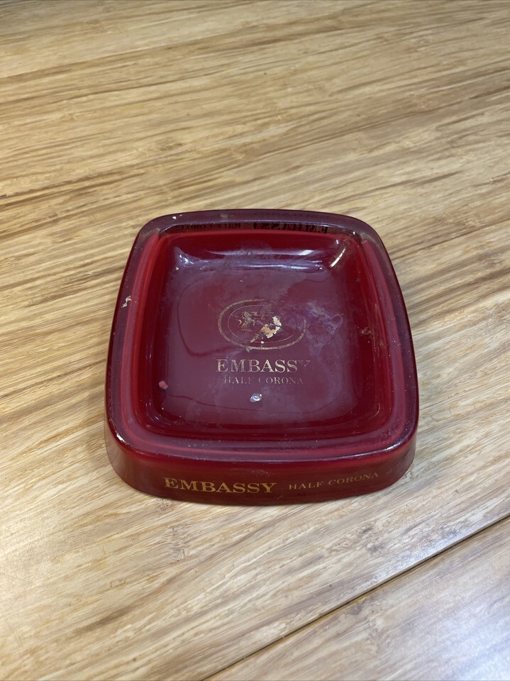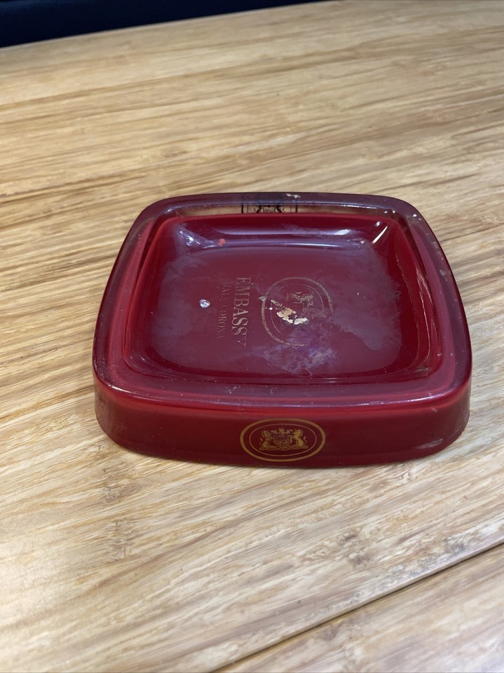 Vintage Embassy Half Corona Red & Clear Glass With Gold Lettering Ashtray KG JD
