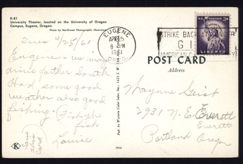 1961 UNIVERSITY THEATRE EUGENE OREGON * mailed 3c Portland OR WOB